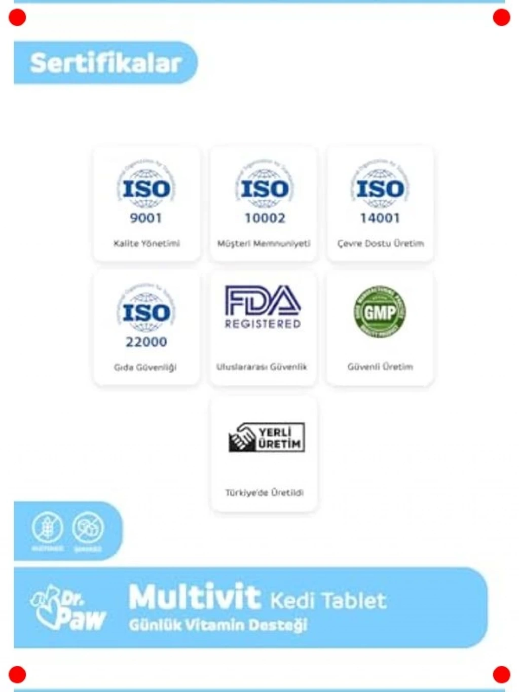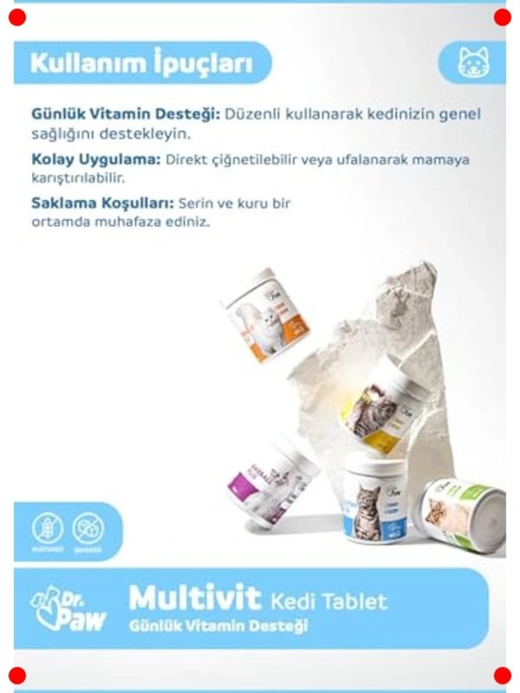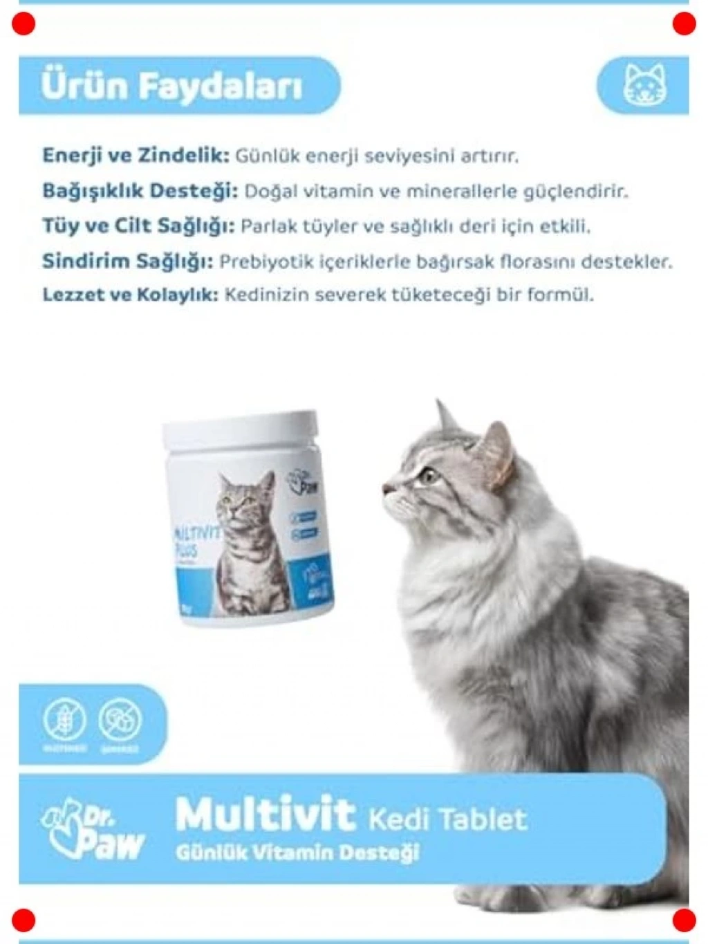 Kedinizin genel sağlığını ve yaşam kalitesini desteklemek amacıyla özel olarak formüle edilmiş bu multivitamin takviyesi, 60 çiğnenebilir tablet içerir. Glütensiz ve şekersiz yapısıyla hassas bünyeli kediler için uygundur. İçeriğindeki zengin vitamin ve mineraller sayesinde bağışıklık sistemini güçlendirir, tüy ve cilt sağlığını iyileştirir. Kedinizin enerji seviyesini artırır ve yaşamsal fonksiyonlarının düzenli çalışmasına yardımcı olur. Lezzetli tabletler sayesinde kolayca verilebilir.