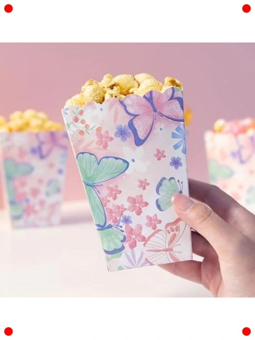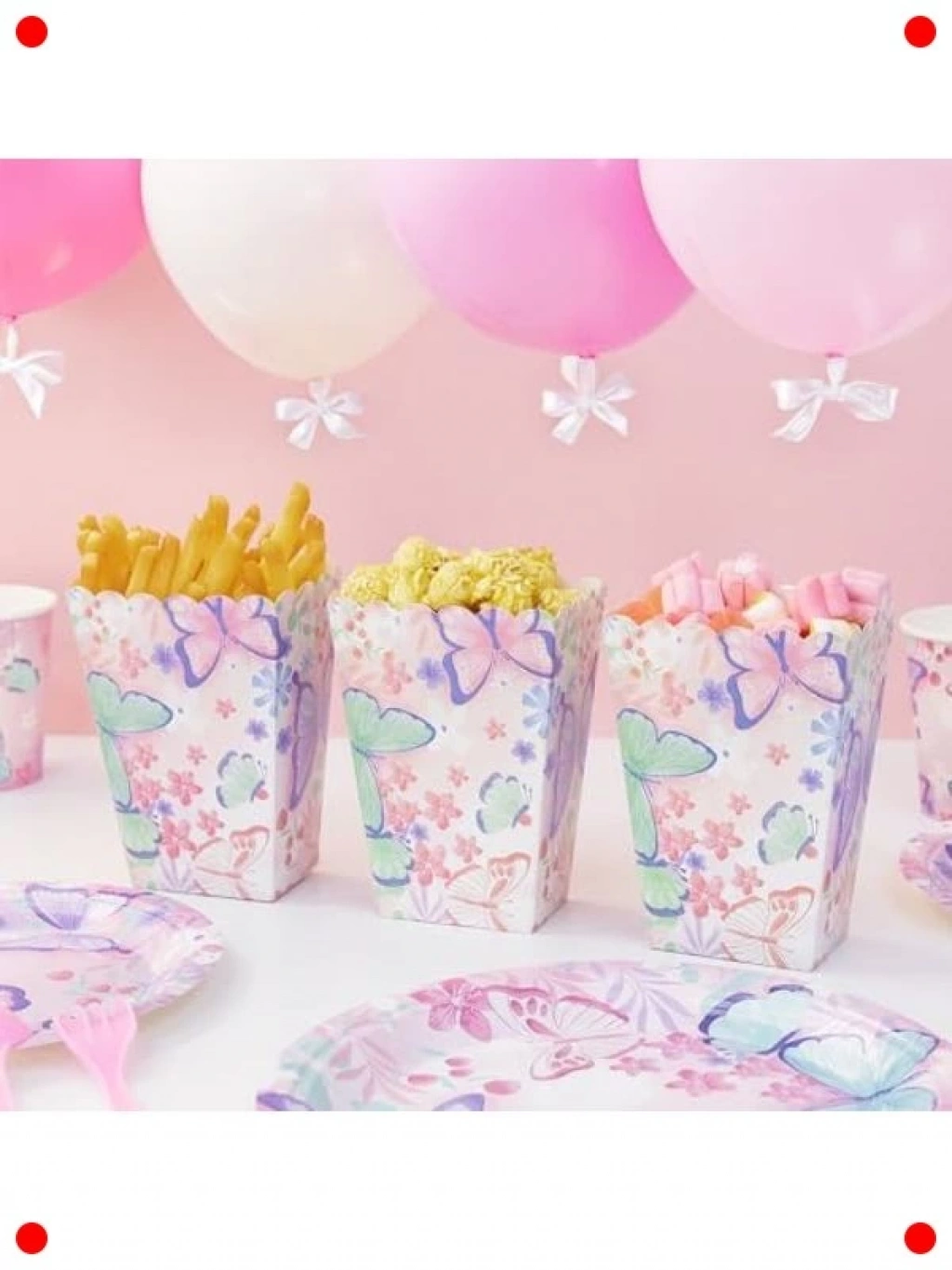 Partilerinize ve özel etkinliklerinize şıklık katacak, kelebek desenli karton popcorn kutuları! 8 adetlik bu set, pembe çiçek detaylarıyla süslenmiş sevimli bir tasarıma sahiptir. Film gecelerinde, doğum günü partilerinde veya herhangi bir kutlamada misafirlerinize patlamış mısır veya diğer atıştırmalıkları sunmak için idealdir. Pratik ve kullanışlı boyutlarıyla (11.5x8.5x6.5 cm) kolayca monte edilebilir ve tek kullanımlık yapısı sayesinde temizlik derdini ortadan kaldırır. Çevre dostu karton malzemeden üretilmiştir. Her kutu, küçük eller için mükemmel bir porsiyonluk ikramlık sunar. Partinizin atmosferini renklendirecek bu kutularla unutulmaz anılar yaratın, misafirlerinize görsel bir şölen sunun.