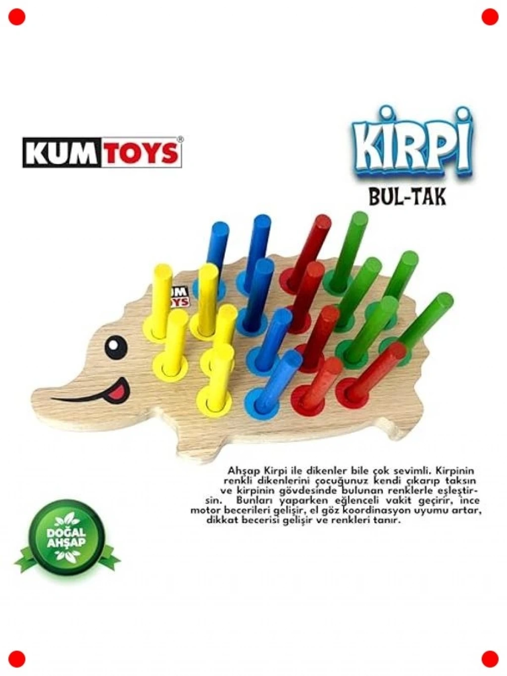 Miniklerin el becerilerini ve zihinsel gelişimini destekleyen bu sevimli kirpi şekilli bul tak oyunuyla tanışın. Çocuklar, renkli ve farklı şekillerdeki parçaları kirpinin sırtındaki doğru yerlere yerleştirerek şekil eşleştirme ve sıralama becerilerini eğlenceli bir şekilde geliştirirler. Canlı renkler ve kolay tutulabilen parçalar, çocukların dikkatini çeker ve oyun deneyimini daha keyifli hale getirir. El-göz koordinasyonunu, ince motor becerilerini ve problem çözme yeteneklerini geliştirirken, çocuklara eğlenceli vakit geçirme imkanı sunar. Güvenli ve dayanıklı malzemelerden üretilmiştir, 1 yaş ve üzeri çocuklar için ideal bir eğitici oyuncaktır.