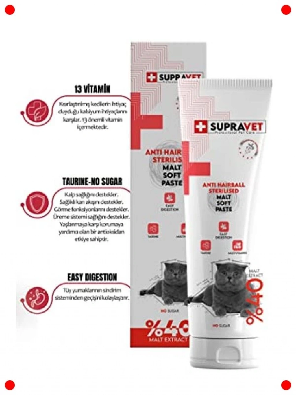 Kısırlaştırılmış kedinizin özel ihtiyaçları için özenle hazırlanmış bu malt macunu ile onun sağlığını destekleyin. Zengin multivitamin içeriği sayesinde bağışıklık sistemini güçlendirir ve genel sağlığını korur. Maltın doğal lifleri, kedinizin midesinde oluşan tüy yumaklarının kolayca atılmasına yardımcı olurken, sindirim sisteminin düzenli çalışmasını destekler. Özellikle kısırlaştırılmış kedilerde görülebilen kilo kontrolü ve idrar yolu sağlığına katkıda bulunur. Lezzetli formülü sayesinde kediniz severek tüketecek, böylece hem sağlıklı hem de mutlu kalacaktır. Günlük rutininde ona sunduğunuz bu özel destekle daha enerjik ve canlı bir yaşam sürmesine yardımcı olun. 100 gramlık pratik ambalajıyla uzun süreli kullanım imkanı sunar.