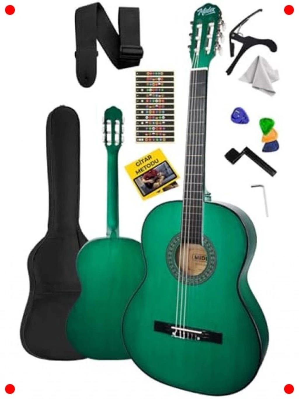 Başlangıç seviyesinden ileri seviyeye kadar tüm gitaristler için ideal olan bu 4/4 yetişkin boy klasik gitar ile müzik yolculuğunuza başlayın. Canlı yeşil rengi, sahne üzerinde veya evde dikkat çekici bir estetik sunar. Sap ayarlı özelliği sayesinde kişisel çalma konforunuza göre uyarlama imkanı sunar, bu da uzun süreli pratikler için önemlidir. Full set olarak sunulan bu gitar, ihtiyacınız olan tüm temel aksesuarlarla birlikte gelir (örneğin pena, kılıf vb.), böylece hemen çalmaya başlayabilirsiniz. Kaliteli ahşap seçimi, sıcak ve dolgun bir ton sağlayarak klasik müzik veya popüler melodiler için mükemmel bir enstrüman oluşturur.