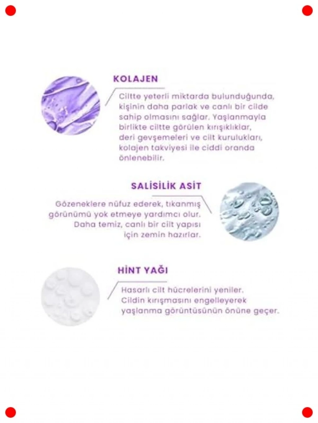 Cildinizin genç ve canlı görünümünü geri kazanmasına yardımcı olacak bu kolajen serum, yaşlanma belirtileriyle savaşmak için özel olarak formüle edilmiştir. Yoğun kolajen içeriği sayesinde cildin elastikiyetini artırır, ince çizgi ve kırışıklıkların görünümünü azaltır. Aynı zamanda genişlemiş gözeneklerin sıkılaşmasına yardımcı olur, cilt tonunu eşitleyerek daha pürüzsüz ve aydınlık bir cilt yüzeyi yaratır. Günlük kullanım için uygun olan bu serum, cildinizi derinlemesine nemlendirir ve yenileyici etkisiyle daha genç bir görünüme kavuşmanızı sağlar.
