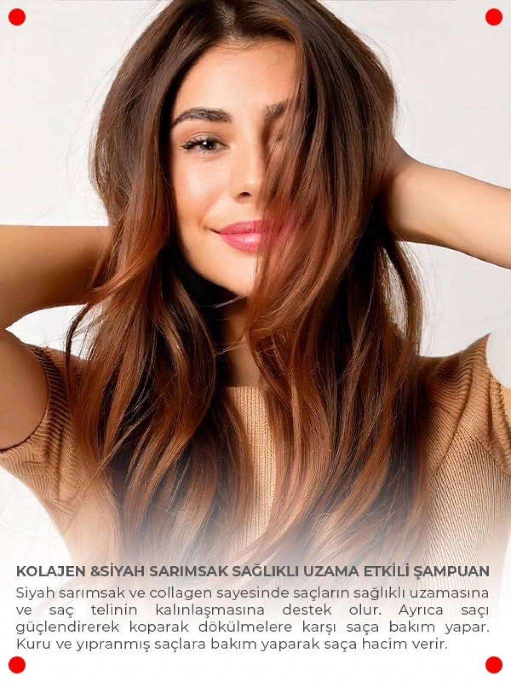 Saçlarınızın sağlıklı uzamasına destek olmak ve güçlenmesini sağlamak için özel olarak formüle edilmiş bu şampuan, kolajen ve siyah sarımsak özleriyle zenginleştirilmiştir. Saç köklerini besleyerek saç dökülmesini azaltmaya yardımcı olurken, saç tellerini güçlendirir ve kırılmalara karşı koruma sağlar. Saç derisini arındırır, kan dolaşımını hızlandırır ve böylece saç büyümesini teşvik eder. Düzenli kullanımda saçlarınızın daha dolgun, parlak ve canlı görünmesini sağlar. 1 litrelik ekonomik boyutuyla uzun süreli kullanım sunan bu şampuan, zayıf ve cansız saçlara yeniden hayat verir. Saçlarınıza doğal bir ışıltı ve güç katın.