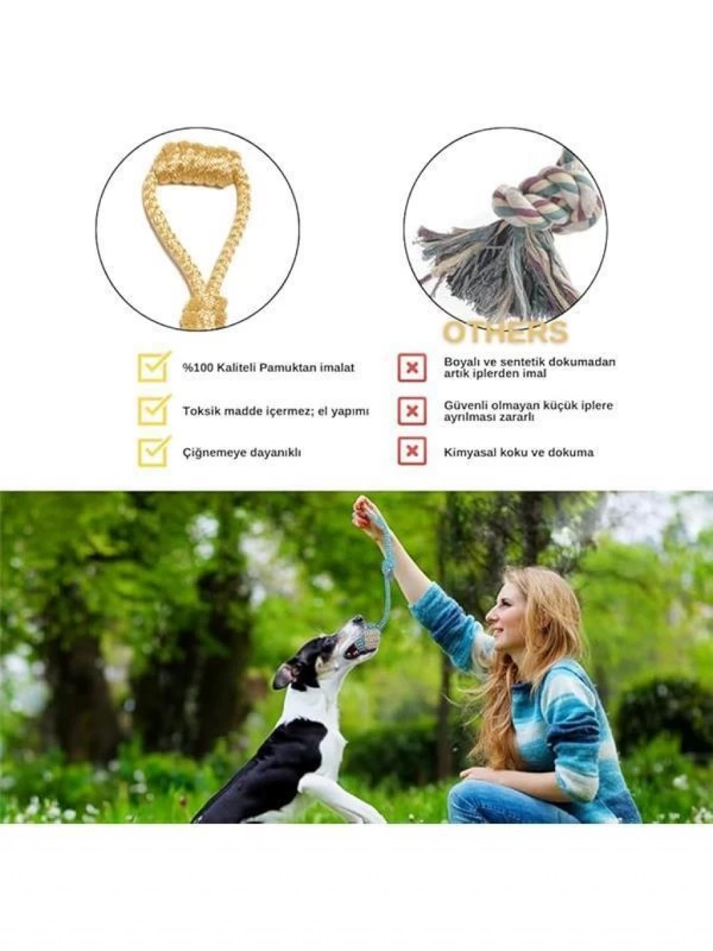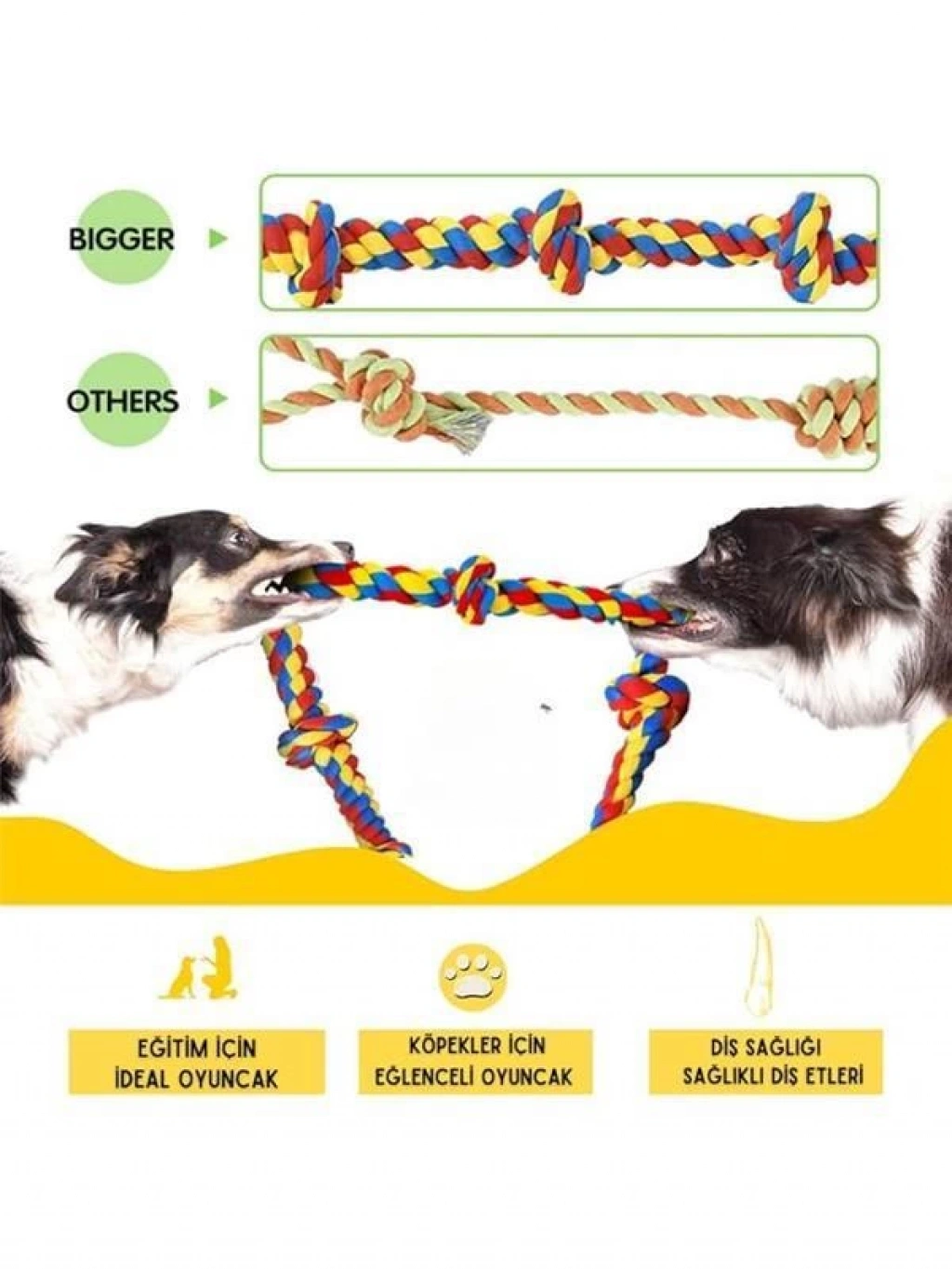 Bu ürün hakkında Çekiştirmeli oyuncaklar köpeklerin severek oynadığı ürünlerdir Köpeğinizle birlikte eğlenmeniz için uygun tasarımda bir üründür Halat kısmından tutarak köpeğinizin topu yakalaması için her hareketle teşvik edeceksiniz Standart büyüklükte olan topun dış kaplaması antibakteriyel sağlıklı plastiktir Köpeklerin yalnız oynaması için de uygundur Köpeklerin diş sağlığını korumak için kullanılan örgü oyun ipi veya diş ipi Kaliteli kotondan imal edilmiştir Köpeklerde diş sağlığı köpek sahiplerinin önem vermesi gereken önemli bir konudur Köpeklerin dişleri yedikleri gıdaları tutma ısırma koparma ve öğütme işlevini yerine getirir Bu nedenle diş temizliği ve sağlığı alınan gıdaların hazmının ilk başladığı organdır Ürün Rengi Stok Durumuna Göre gönderilecektir