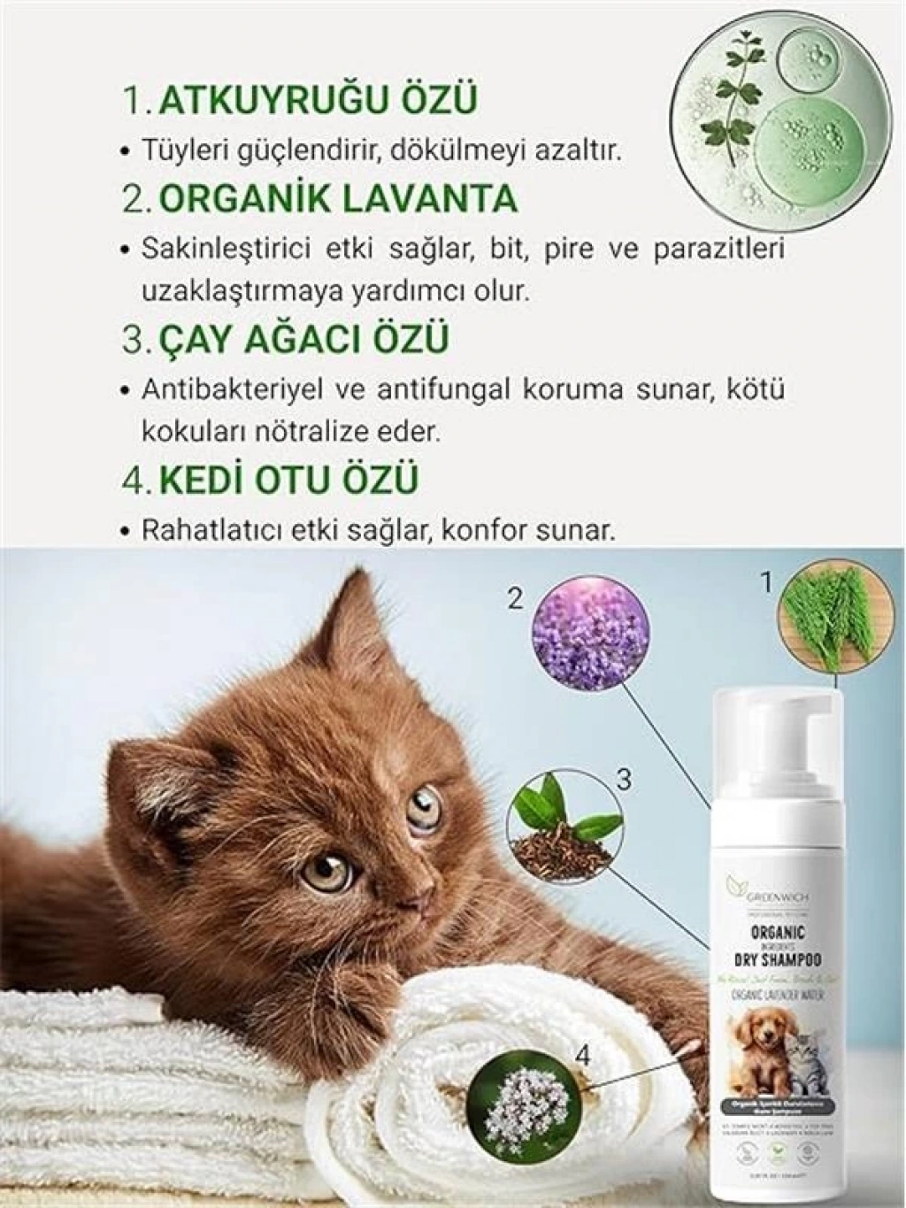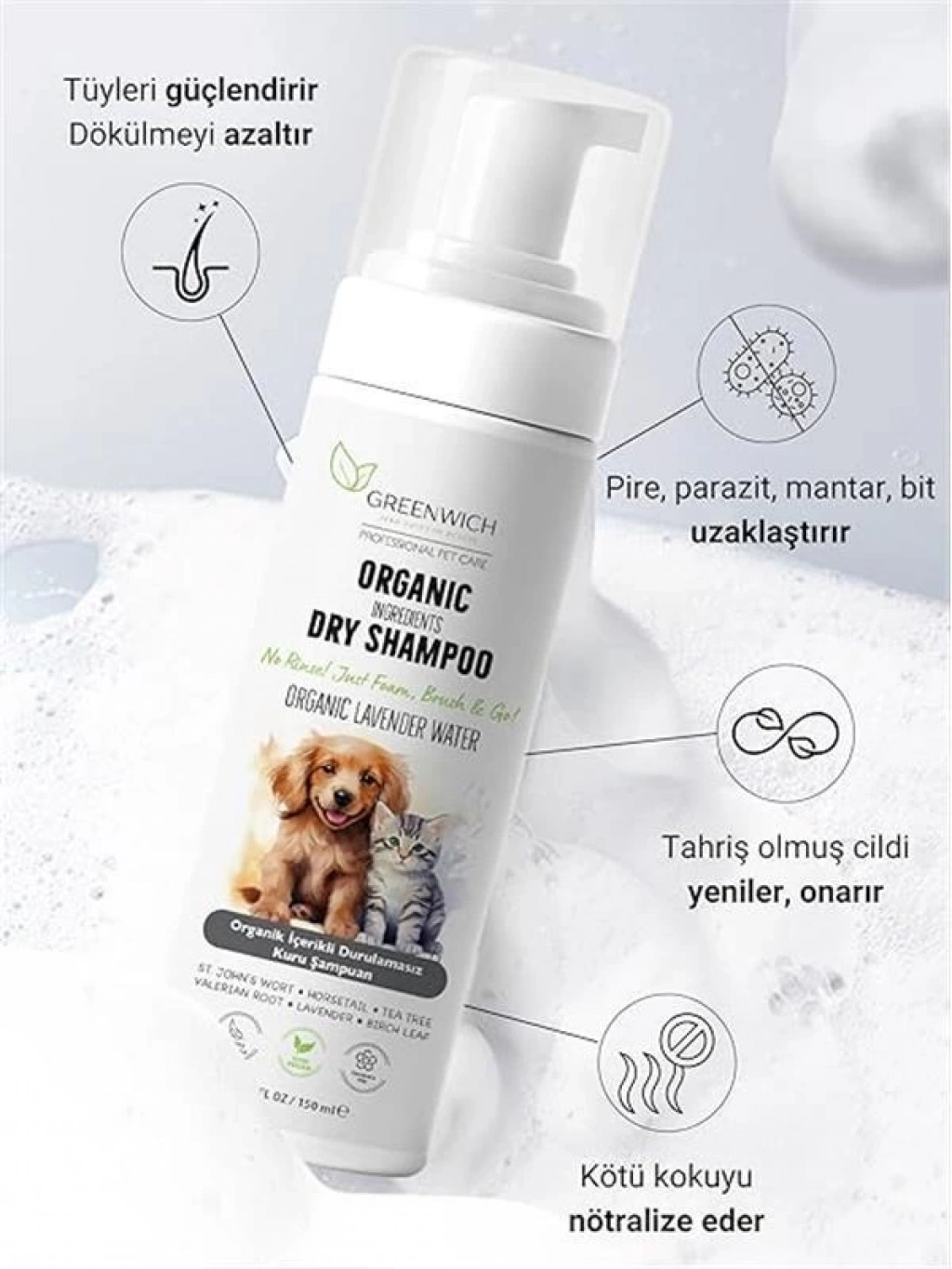 Bu ürün hakkında KURU TEMİZLEME Su gerektirmeyen köpük formülü ile evcil hayvanlarınızı kolayca ve hızlıca temizler LAVANTA ÖZLÜ Hoş kokulu lavanta özü içeren formül evcil hayvanınızın tüylerinde ferah bir koku bırakır KULLANIM KOLAYLIĞI Özel tasarlanmış pompa başlığı sayesinde kolay uygulama ve etkili temizlik sağlar UYGUN BOYUT 150 ml kapasiteli şişe ile uzun süreli kullanım imkanı sunar HASSAS FORMÜL Kedi ve köpeklerin hassas ciltlerine uygun olarak geliştirilmiş özel formül