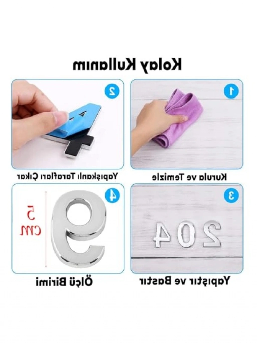 Küçük boyutlu 50 mm yapışkanlı kapı numarası, ev veya iş yeri numaralandırmalarınız için mükemmel bir seçenektir. Krom rengi ile şık bir görünüm sunar ve her alanda kolayca uygulanabilir. Yapışkan arka yüzeyi sayesinde montajı son derece basittir. Uzun ömürlü ve dayanıklı yapısı ile dış etkenlere karşı dirençli bir kullanım sağlar.