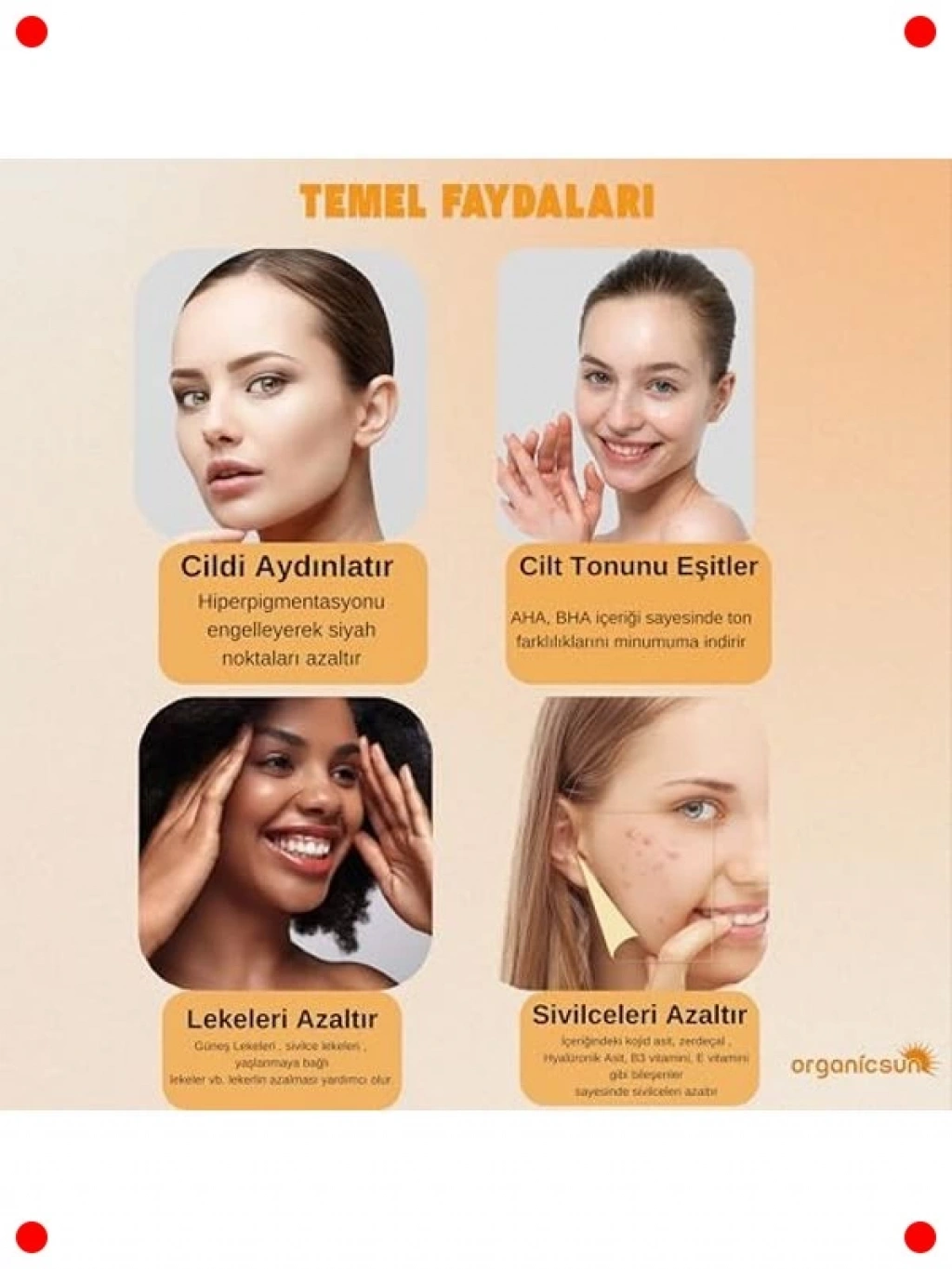Kojik asit ve zerdeçalın gücüyle formüle edilmiş bu aydınlatıcı sabun, cilt lekeleri ve sivilce problemlerine karşı etkili bir çözümdür. İçeriğindeki Kojik Asit, Kolajen, AHA, BHA, C Vitamini, Hyaluronik Asit ve Shea Butter Yağı gibi zengin bileşenler sayesinde cildinizi derinlemesine temizler, lekelerin görünümünü azaltır ve cilt tonunu eşitlemeye yardımcı olur. Sivilce oluşumunu engellerken, cildin doğal bariyerini destekler ve nemlendirir. Aydınlatıcı etkisiyle daha parlak ve canlı bir cilt sunar. 140 gramlık boyutuyla uzun süreli kullanım sağlar. Düzenli kullanımda cildinizin daha pürüzsüz, berrak ve ışıltılı olmasına katkıda bulunur.