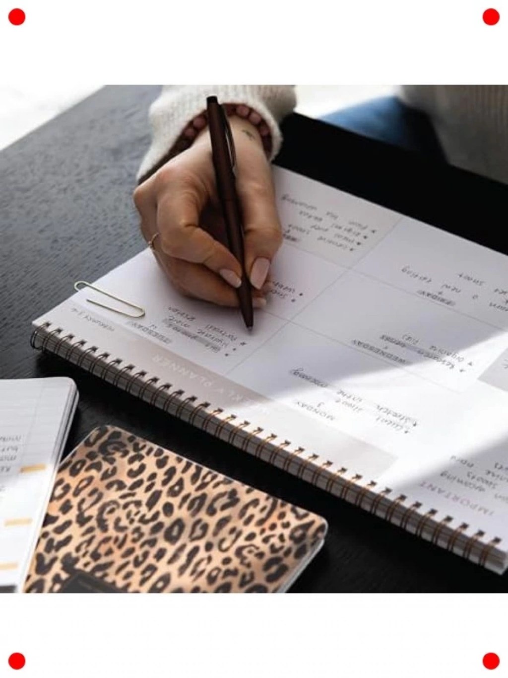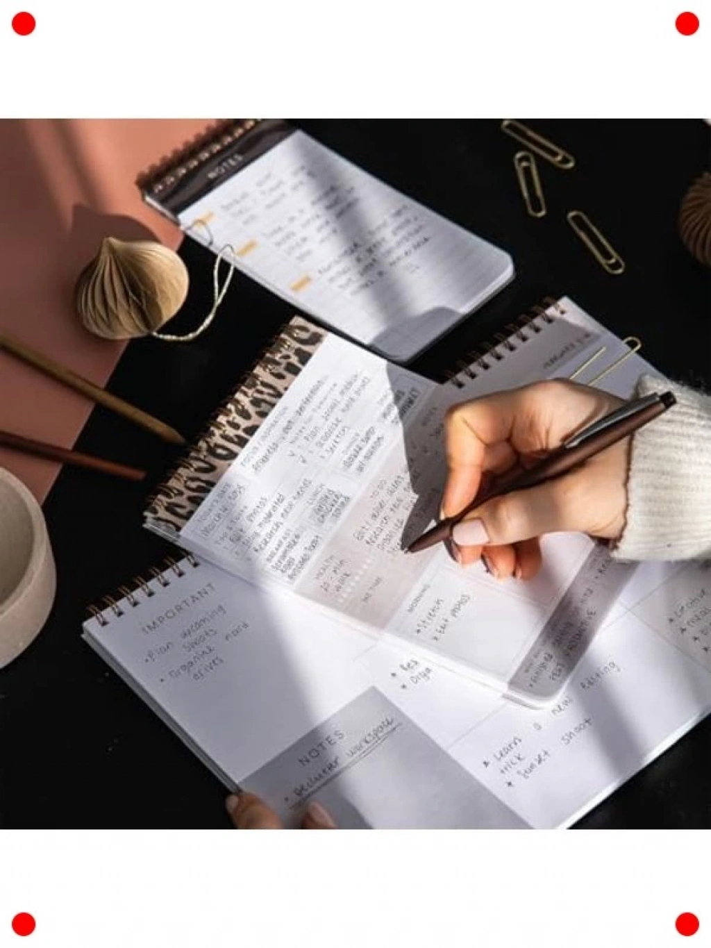 Günlük ve haftalık planlarınızı şık bir şekilde organize etmek için tasarlanmış bu leopar desenli süresiz masaüstü planlayıcı seti, 3 adet A4 boy planlayıcı içerir. Tarihsiz yapısı sayesinde dilediğiniz zaman kullanmaya başlayabilir, hiçbir sayfayı boşa harcamadan verimli bir şekilde planlama yapabilirsiniz. Her planlayıcı, haftalık ve günlük görevlerinizi, randevularınızı ve hedeflerinizi düzenlemeniz için geniş alanlar sunar. Göz alıcı leopar deseni, çalışma masanıza modern ve şık bir dokunuş katar. Öğrenciler, çalışanlar ve ev hanımları için idealdir. Daha düzenli, üretken ve stil sahibi bir yaşam için bu planlayıcı setini tercih edin.