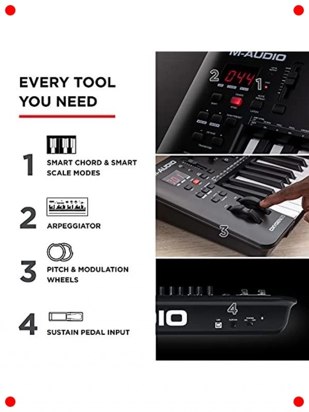 Modern stüdyo aksesuarları - 25 vuruş dinamik, orijinal boyutlu piyano tarzı tuşlu MIDI denetleyicisi doğal bir tepki sunar, sanal örnekleyici ve sentezleyici eklentileri için idealdir Daha iyi vuruşlar yapın – 8 arkadan aydınlatmalı, vuruşa duyarlı davul pedli 2 bank - vuruş üretimi, klips başlatma, ses tahtası tetikleme halkası ve daha fazlası için Stüdyo aksesuarlarınızla dokunsal kontrol - sanal synth parametrelerinin, efekt eklentilerinin, DAW kontrolünün ve daha fazlasının dokunsal MIDI kontrolü için 8 atanabilir regülatör ve 1 atanabilir fader Hepsi bir arada – DAW kontrolleri ve eklenti parametreleri için zahmetsiz otomapping; Smart Chord & Smart Scale modu; Arpegiator; Pitch & Mod tekerlekler; Sustain pedal girişi; USB-Midi kablosu dahildir Komple yazılım üretim paketi dahildir - MPC Beats, Ableton Live Lite, AIR Music Tech (Hybrid 3 & Mini Grand) 2 sanal enstrüman ve 5 Akai Professional MPC genişletme paketi M-Audio web sitesini ziyaret etmek ve düzenli olarak en yeni yazılım ve aygıt yazılımı güncellemelerini almak için lütfen pakette bulunan indirme kartını kullanın