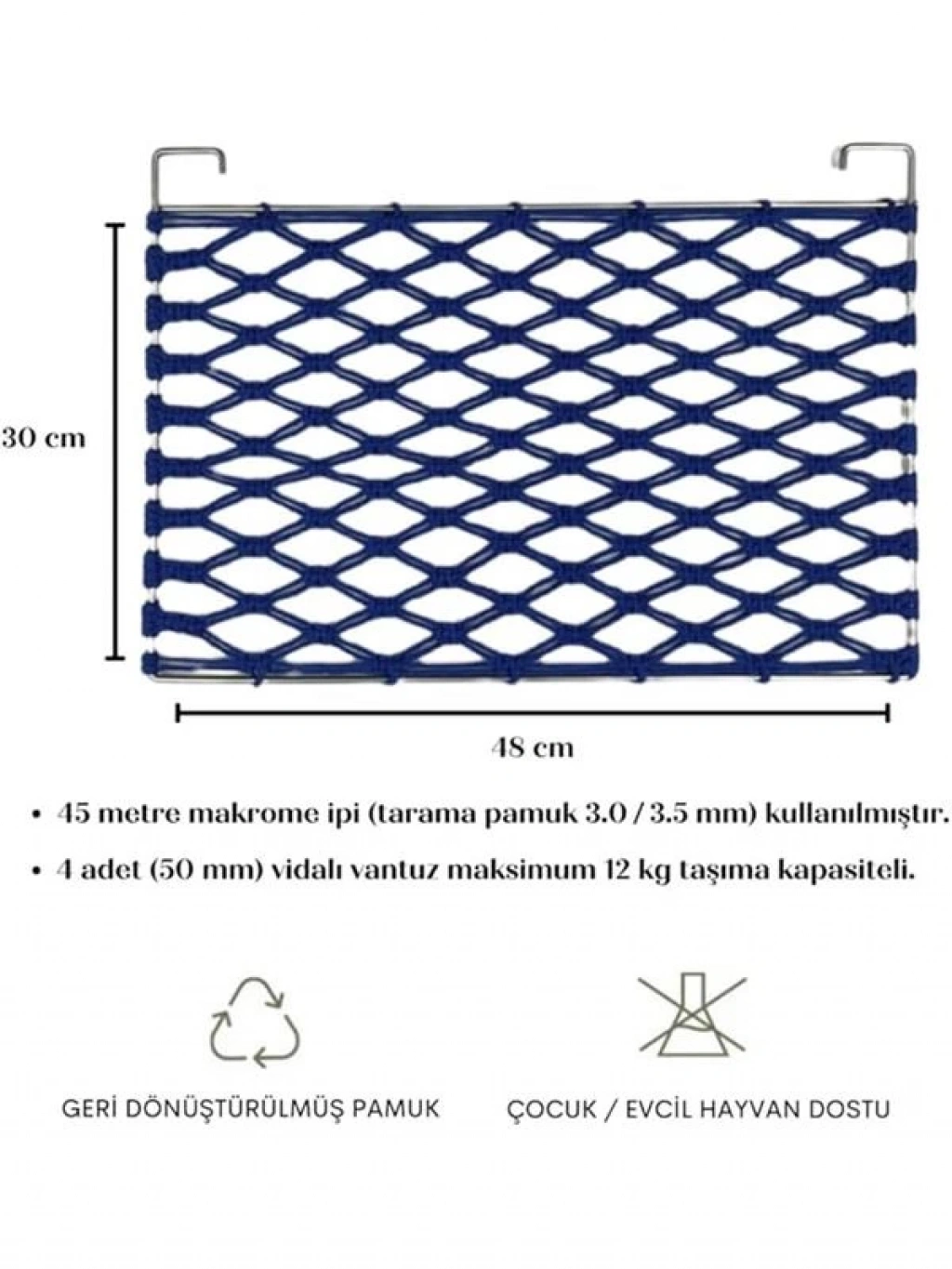 Bu ürün hakkında El yapımı Maksimum 12 kga kadar taşıma kapasitesi 3035 mm tarama pamuk makrome ipi Yatak boyutu 48x30 cm
