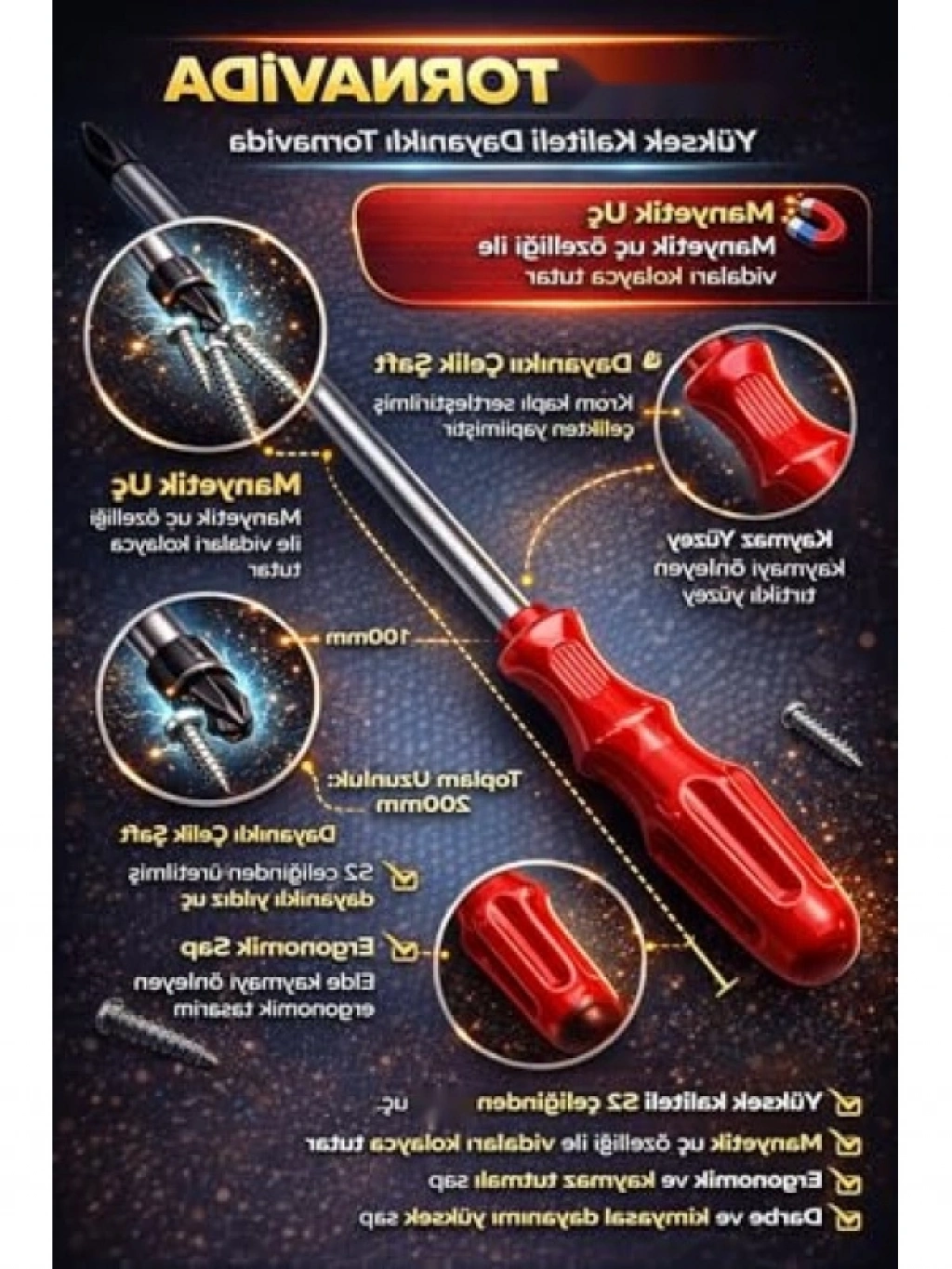 Bu manyetik uçlu yıldız tornavida, vida düşmesini önleyerek tek elle kolay kullanımı sağlar. Ergonomik ve kaymaz sap tasarımı, uzun süreli kullanımlarda el yorgunluğunu azaltır. Yüksek kaliteli çelikten üretilmiş şaftı, eğilmelere ve aşınmalara karşı dayanıklıdır. Ev tamiratları, inşaat ve nalburiye işleri için idealdir. Çok çeşitli uygulamalarda kullanılabilen bu tornavida, pratik bir çözüm sunar.