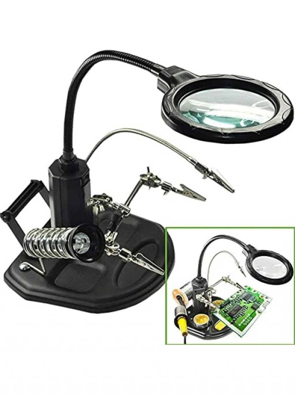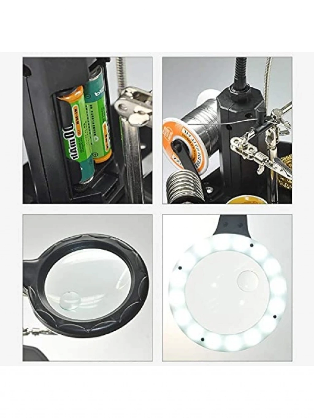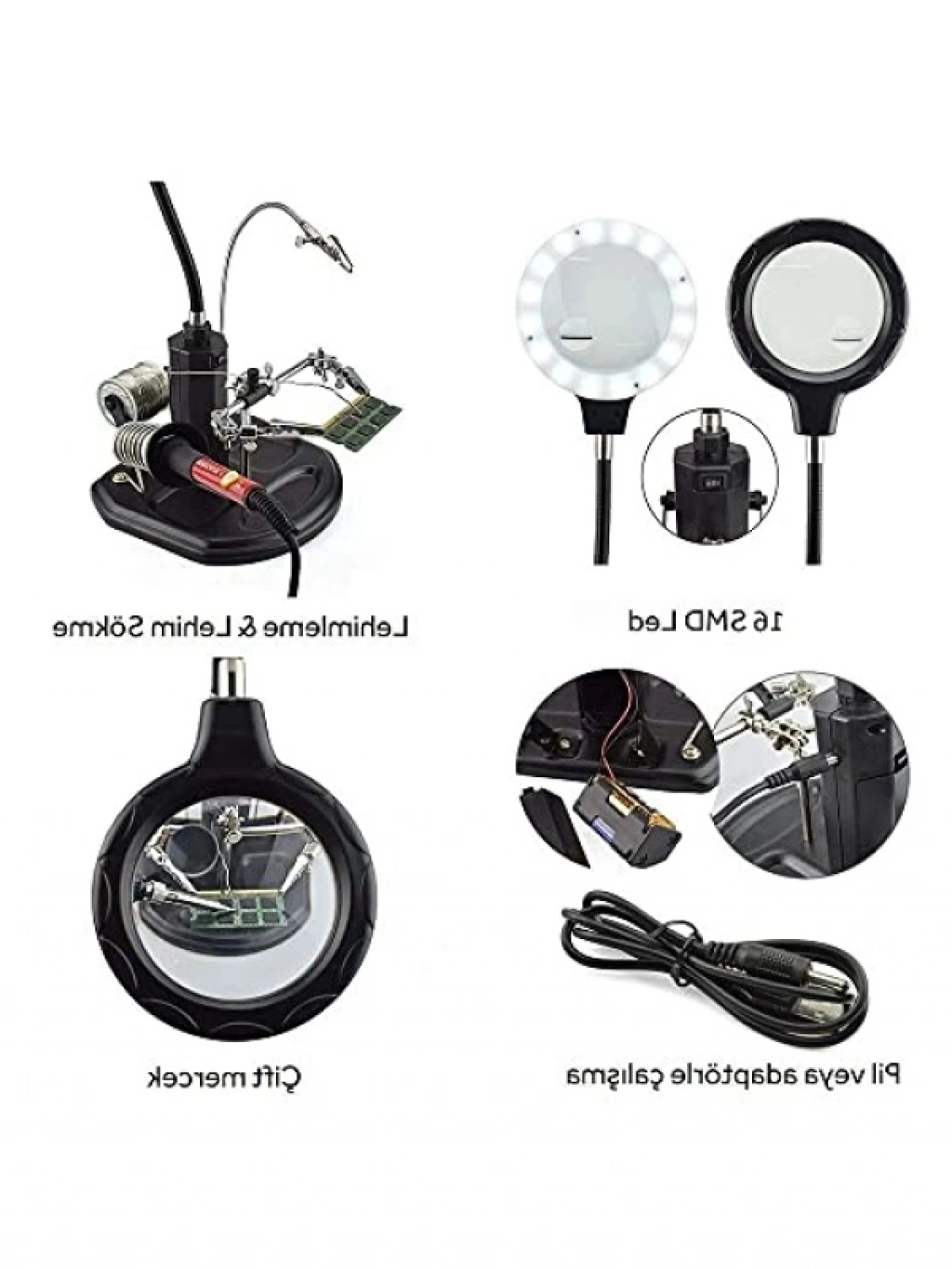 Büyüteç merceği 85mm boyutunda olup, 2.5X (6 diyoptri) ve 4X (12 diyoptri) büyütme özelliklerine sahiptir. 16 adet MSD LED kaynağı ile aydınlatılan bu ürün, detaylı çalışmalarınızı kolaylaştırır. Stand boyutları 178x178mm olup, büyüteç kolu 265mm uzunluğundadır. Timsah klipsleri ve mil tutucu, rahat bir kullanım sunarak hobi ve profesyonel işlerinizde size yardımcı olur.