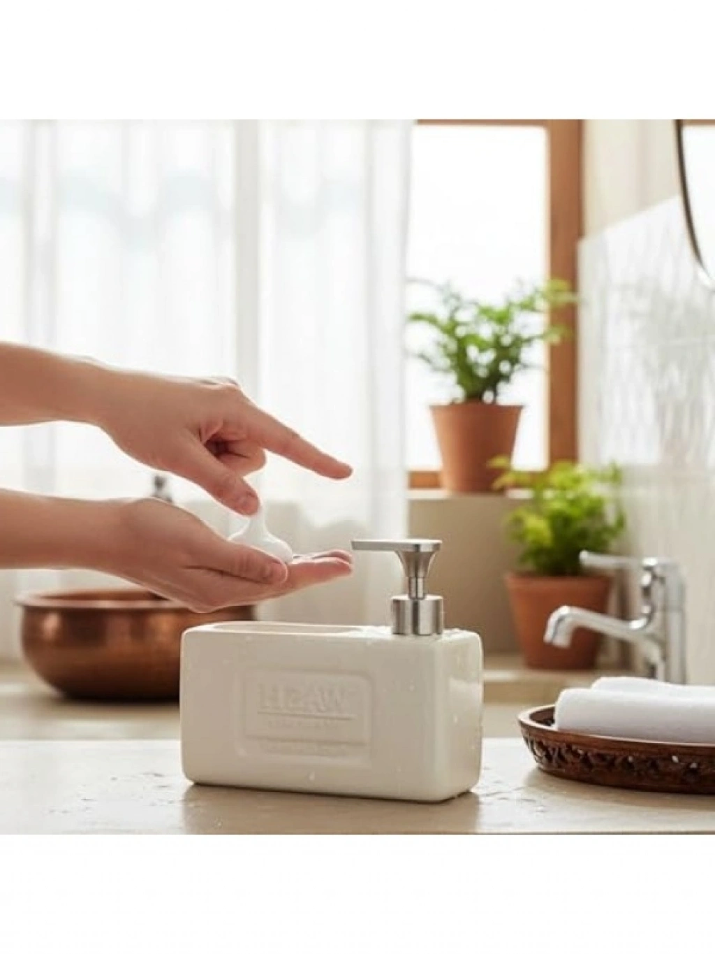 Bu pratik 2'si 1 arada sabunluk, mutfak tezgahınızda düzen sağlamanın yanı sıra estetik bir görünüm de sunar. Entegre sünger haznesi ile bulaşık deterjanı ve süngeri tek bir alanda toplar. Yüksek kaliteli mat seramik malzemeden üretilmiş olan bu sabunluk, su damlacıklarını gizleyerek her zaman temiz görünüm sağlar. Estetik metal pompası, modern bir dokunuş eklerken, geniş hacim seçenekleri ile sık dolum yapma ihtiyacını ortadan kaldırır. Çok yönlü kullanım alanı ile mutfak ve banyoda şık bir dekoratif obje olarak yer alır.