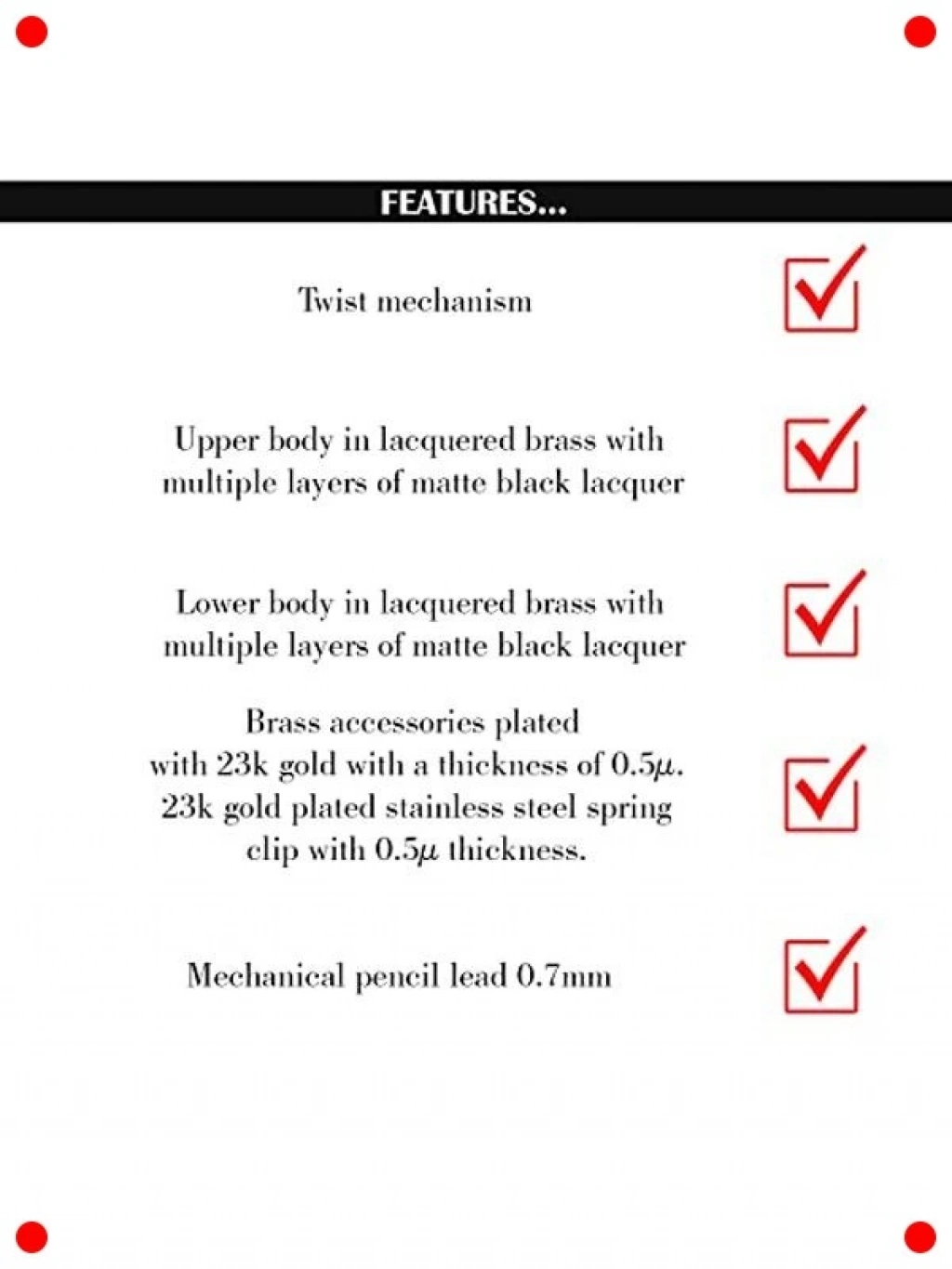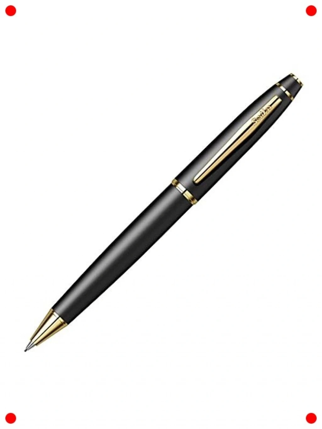 Profesyonel çizim ve yazılarınız için tasarlanmış mat siyah ve altın detaylara sahip şık mekanik kurşun kalem. Sağlam metal gövdesi, dayanıklılık ve uzun ömürlü kullanım sunarken, dengeli ağırlığı konforlu bir yazım deneyimi sağlar. Hassas ucu sayesinde detaylı çizimler ve net yazılar kolayca oluşturulabilir. Ergonomik tasarımı, uzun süreli kullanımlarda bile el yorgunluğunu azaltır. Estetik görünümüyle masaüstünüze prestij katarken, günlük notlardan teknik çizimlere kadar geniş bir kullanım alanına sahiptir. Kalite ve zarafeti bir arada arayanlar için idealdir.