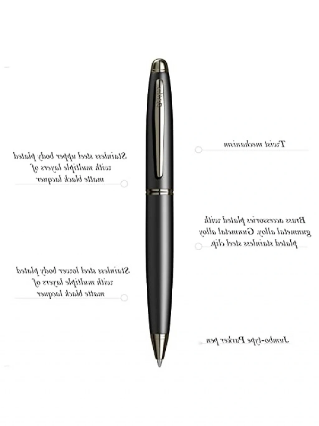 Bu tükenmez kalem, mat siyah rengi ve paslanmaz çelik kapak tasarımı ile şık bir görünüm sunar. Krom kaplama klips ve halka ile estetik bir detay katılmıştır. Çevirmeli otomatik mekanizması sayesinde kullanım kolaylığı sağlar. Yüksek kaliteli mürekkep ile yazım akışını destekleyerek, profesyonel bir yazım deneyimi sunar. Ofislerde ve günlük hayatta kullanıma uygun, şık bir yazım aracı!