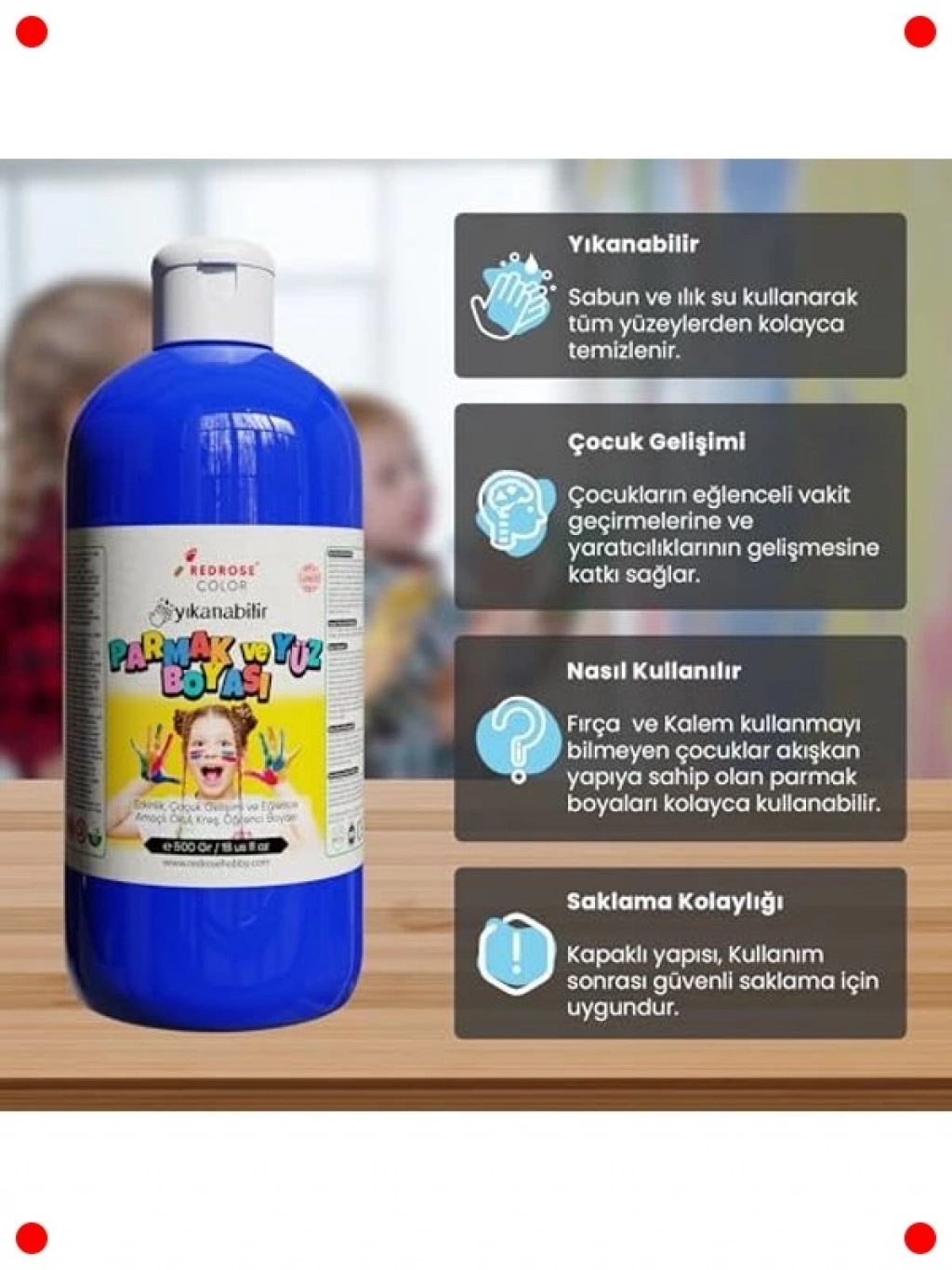 Çocukların sınırsız yaratıcılıklarını ortaya çıkarmak için özel olarak formüle edilmiş bu 500 gramlık mavi parmak boyası, güvenli ve toksik olmayan yapısıyla ebeveynlerin ilk tercihidir. Canlı mavi rengi, çocukların resimlerini ve el sanatlarını neşeli bir hale getirir. Kolayca temizlenebilen formülü sayesinde oyun sonrası temizlik dert olmaktan çıkar. Parmak boyası, çocukların dokunsal duyularını geliştirirken, el-göz koordinasyonunu ve ince motor becerilerini güçlendirir. Geniş ambalajı sayesinde uzun süreli kullanım sunar ve anaokulları, ev etkinlikleri veya sanatsal projeler için idealdir. Çocukların eğlenerek öğrenmesini sağlayan bu boya ile hayal güçlerinin sınırlarını zorlayın.