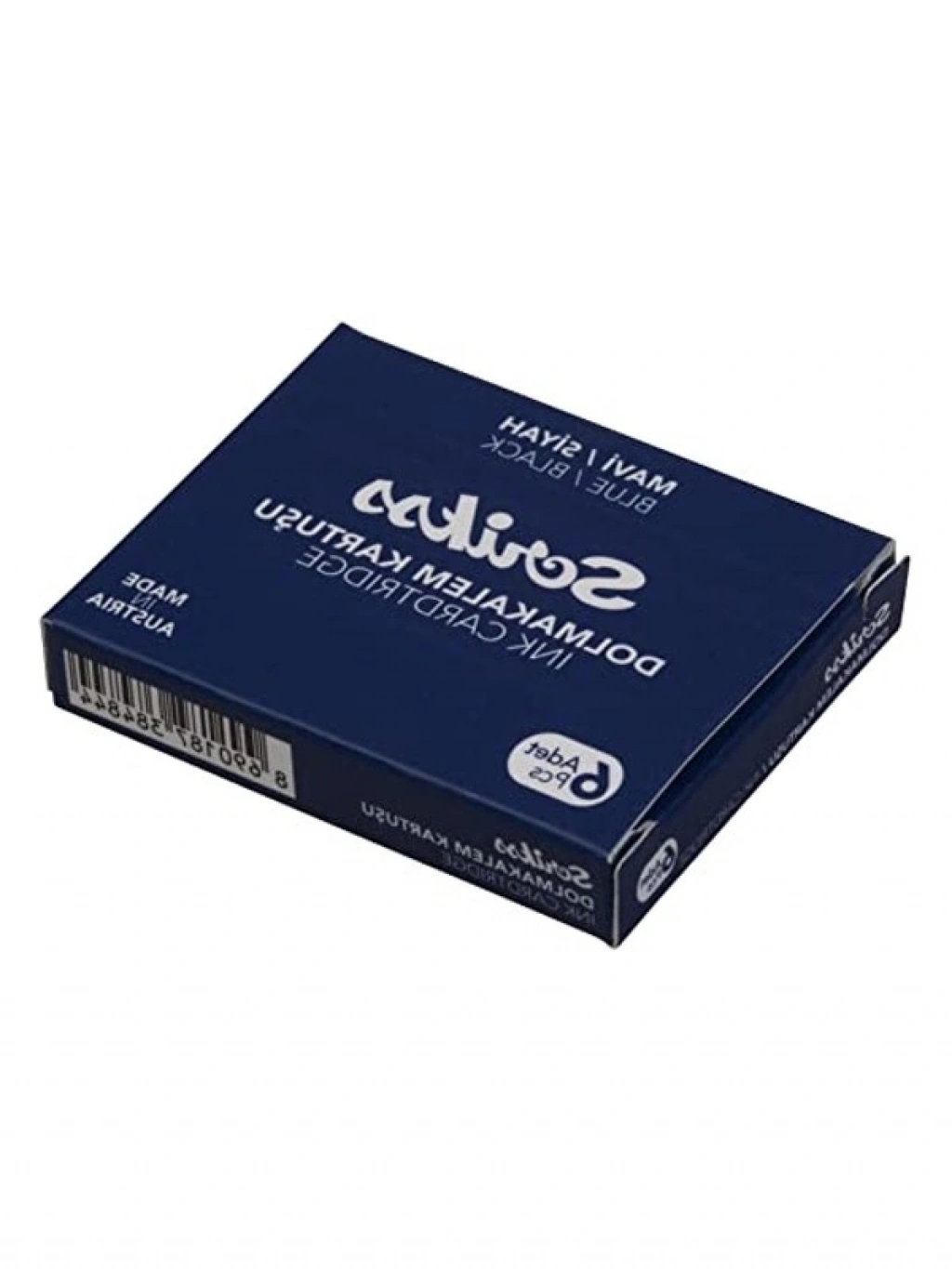 Mavi siyah renk seçenekleriyle sunulan 6'lı dolma kalem kartuşu, yarı saydam akrilik materyalden üretilmiştir. Bu kartuşlar, mürekkep seviyesinin kontrol edilmesine olanak tanırken, çabuk kuruyan kalıcı mürekkebiyle yazma eylemini sanata dönüştürür. Her dolma kalem modeliyle uyumlu olan bu kartuşlar, yazım keyfini artırır.