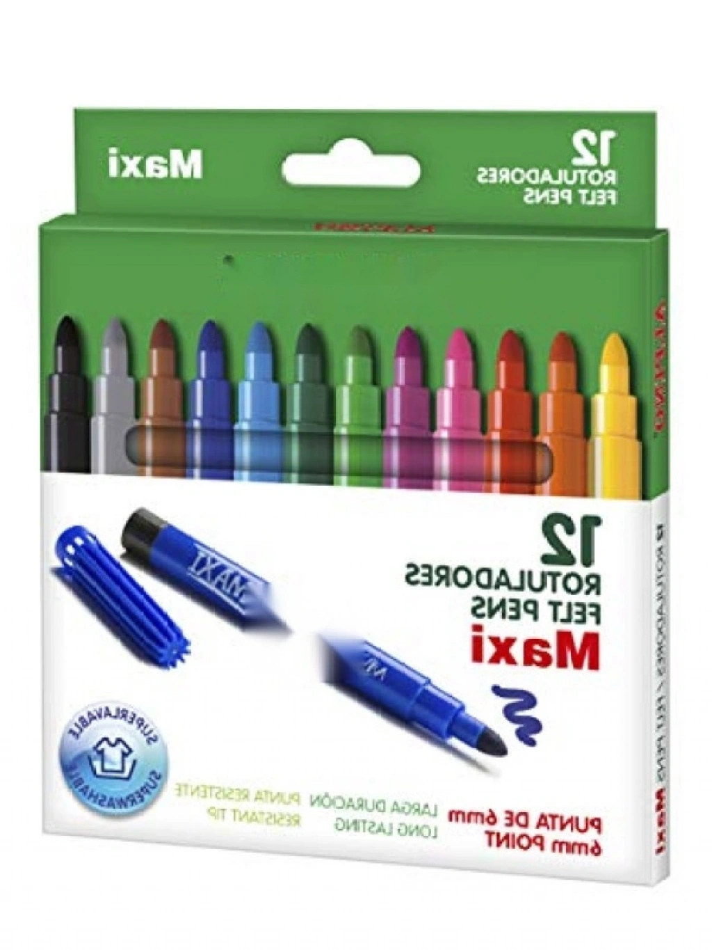 Bu set, 12 adet dayanıklı maxi keçeli kalem içermektedir. 6mm kalınlığında uca sahip olan bu kalemler, günlük ve profesyonel kullanım için idealdir. Su bazlı içeriği sayesinde yıkanabilir ve uzun süre kullanılabilir.