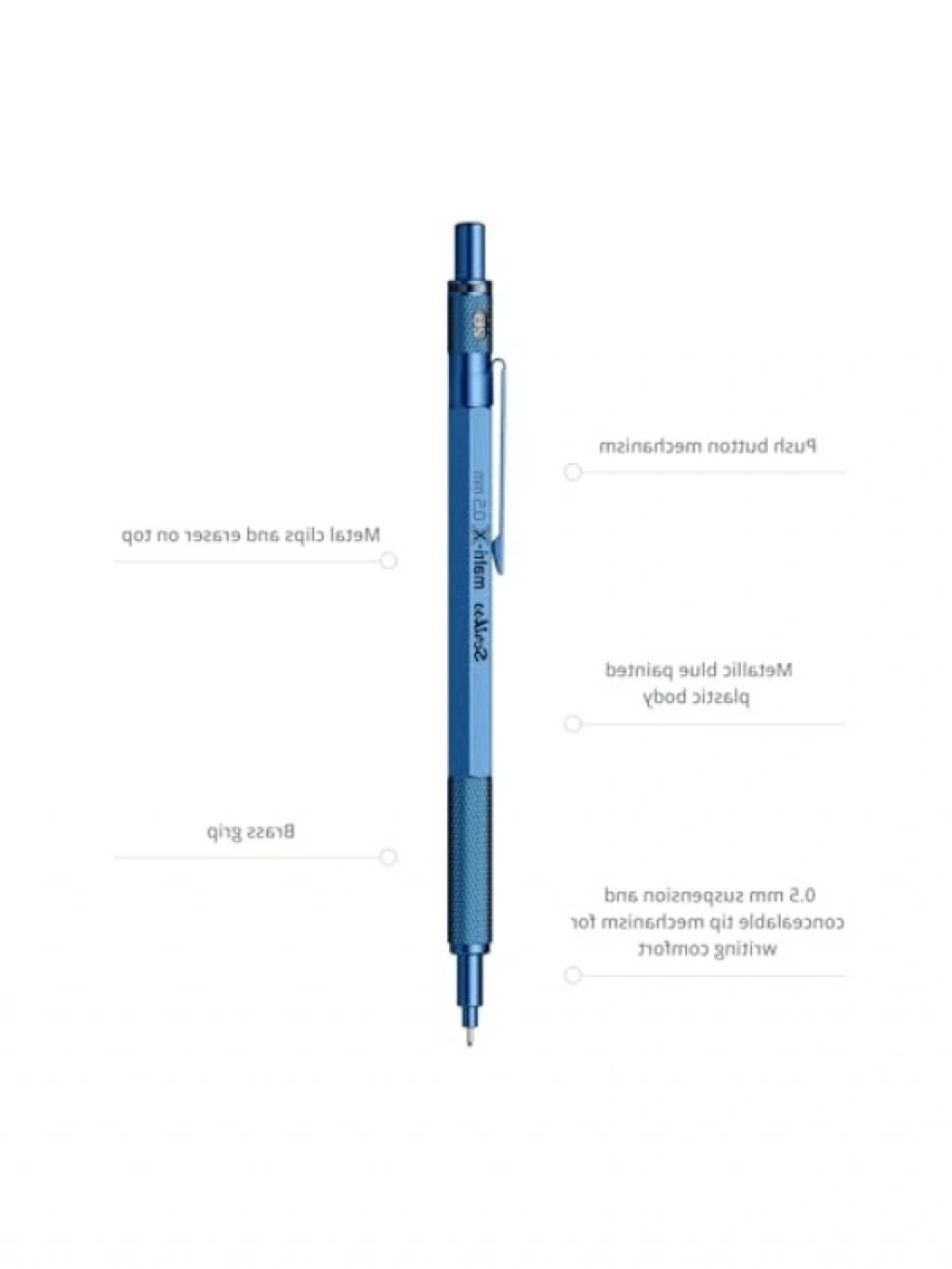 Bu metalik mavi versatil kalem, 0.5 mm uç kalınlığı ile net ve keskin yazılar yazmanızı sağlar. Ergonomik tutuşu sayesinde uzun süreli kullanımlarda bile konfor sunar. Tepeden basmalı mekanizması ile pratik bir kullanım imkanı sunarken, metal klipsi ile kolayca cebe takabilirsiniz. Yazım konforu için süspansiyonlu ve gizlenebilir uç mekanizması ile donatılmıştır, bu da kaleminizi her zaman hazır hale getirir.