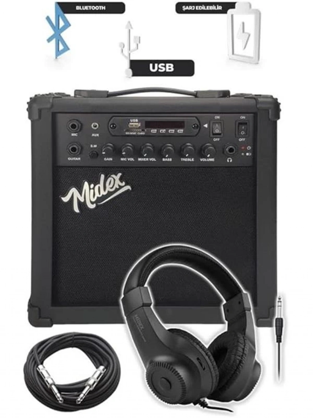 MGA-25BKBT-HD ŞARJLI Elektro Gitar Amfisi 25 Watt USB Bluetooth Distortion Kulaklık ve Kablo