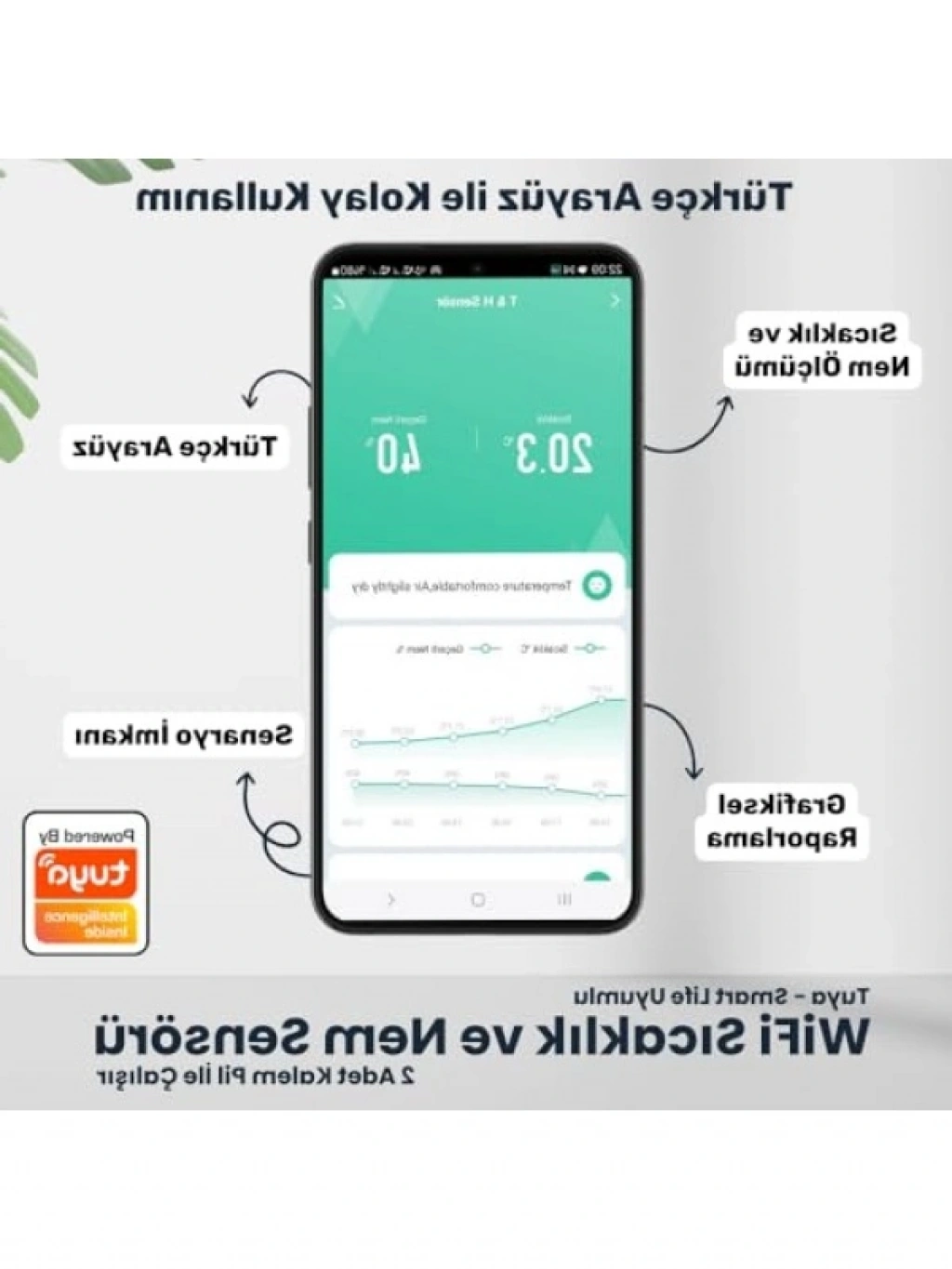 Bu mini sıcaklık ve nem sensörü, Tuya ve SmartLife uyumlu olarak tasarlanmıştır. İki adet AAA pil ile çalışan cihaz, IP65 su geçirmez özelliği ile dış mekan kullanımlarında dahi güvenilir bir performans gösterir. LCD ekranı sayesinde sıcaklık ve nem değerlerinizi anlık olarak takip edebilir, evinizin iklim kontrolünü kolaylıkla yapabilirsiniz. Kompakt yapısı ile her alana rahatça yerleştirilebilir.