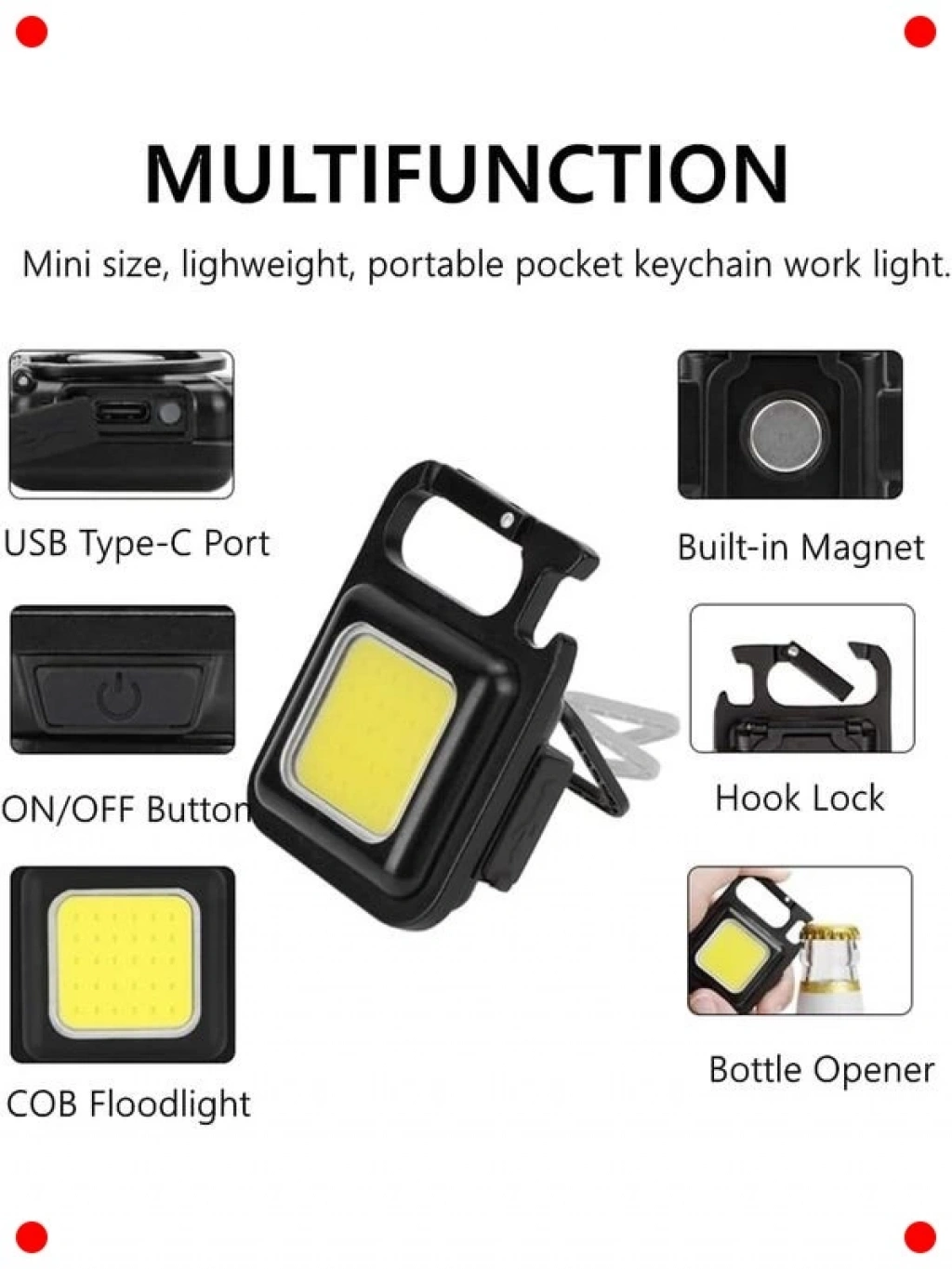 Çok yönlü kullanıma sahip bu mini şarj edilebilir LED anahtarlık feneri, kompakt boyutuna rağmen güçlü bir aydınlatma sunar. COB LED teknolojisi sayesinde geniş bir alanı parlak ve homojen bir ışıkla aydınlatır. Anahtarlığınıza takılabilecek kadar küçük ve hafiftir, böylece her zaman yanınızda taşıyabilirsiniz. Dahili şarj edilebilir bataryası, uzun ömürlü kullanım sağlarken, USB şarj portu sayesinde kolayca şarj edilebilir. Manyetik tabanı ve entegre kancası, eller serbest kullanım imkanı sunarak, kamp, araç onarımı, acil durumlar veya garaj çalışmaları gibi birçok senaryoda pratiklik sağlar. Her ev ve her cep için vazgeçilmez bir yardımcıdır.