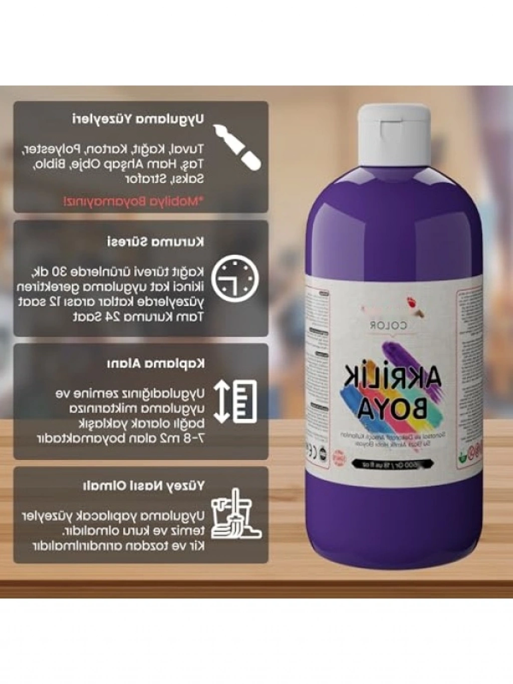 Sanat projeleriniz için mükemmel bir seçenek olan 500 gr'lık mor renk akrilik boya, canlı ve kalıcı renkler sunar. Yüksek kaliteli pigmentler ile formüle edilmiştir, kolay uygulama sağlar ve hızlı kurur. Farklı yüzeylerde kullanılabilir, resimlerinizi ve sanatsal çalışmalarınızı canlandırmak için idealdir. Hem profesyonel sanatçılar hem de hobi olarak resim yapanlar için vazgeçilmez bir üründür.