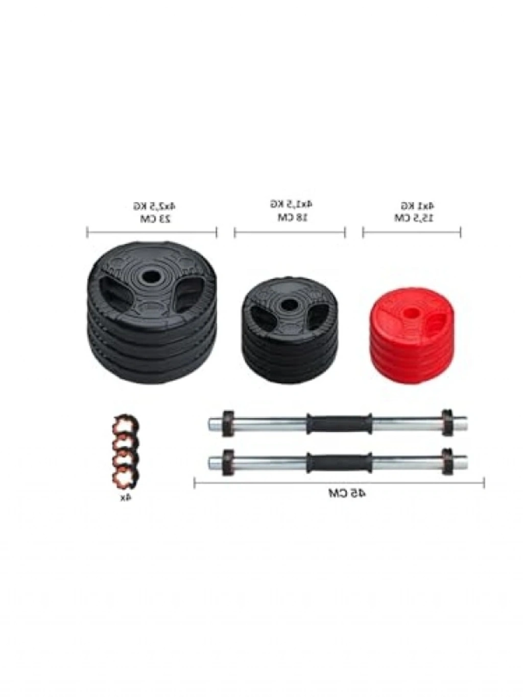 Bu dambıl seti, 2x10,5 kg ağırlığında iki adet kısa bar ile birlikte gelir. İçeriğinde 4 adet 2.5 kg, 4 adet 1.5 kg ve 4 adet 1 kg plaka bulunmaktadır. Özel tasarımı sayesinde her bir plaka, ayrı bir dambıl olarak kullanılabilir. Plastik sıkıştırma aparatları ile güvenli bir şekilde montaj yapabilir, antrenmanlarınızı verimli bir şekilde gerçekleştirebilirsiniz. Spor salonu ya da ev kullanımı için ideal bir settir.