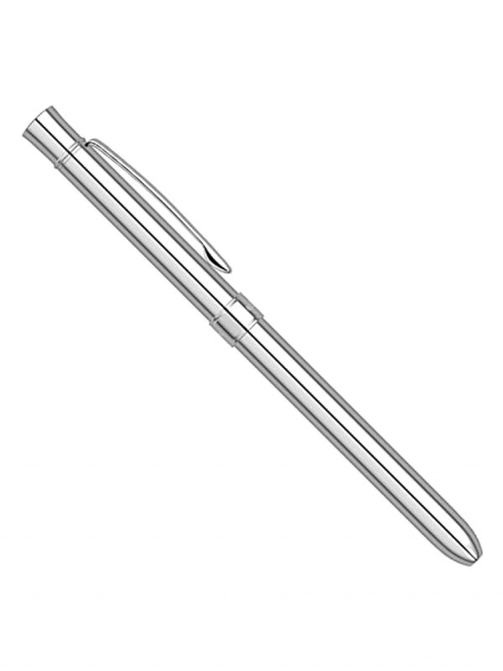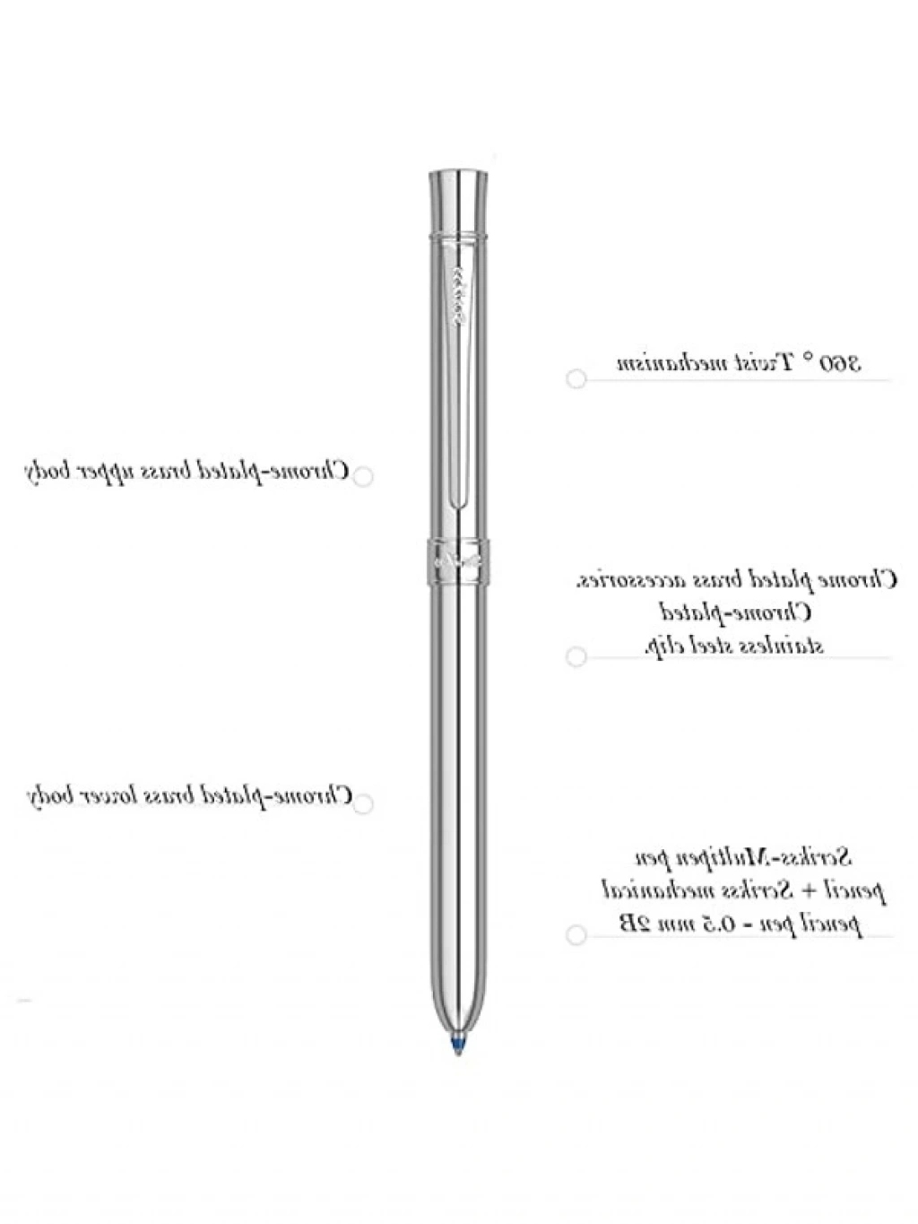 Krom kaplama üst gövdeye sahip multifonksiyonel kalem, çevirmeli mekanizması ile 360 derece döner. Tepede gizli silgi bulunur ve krom kaplama klips ile halka, özel bir tasarım sunar. Krom kaplama gövde, hem estetik hem de dayanıklılığı ile dikkat çeker.
