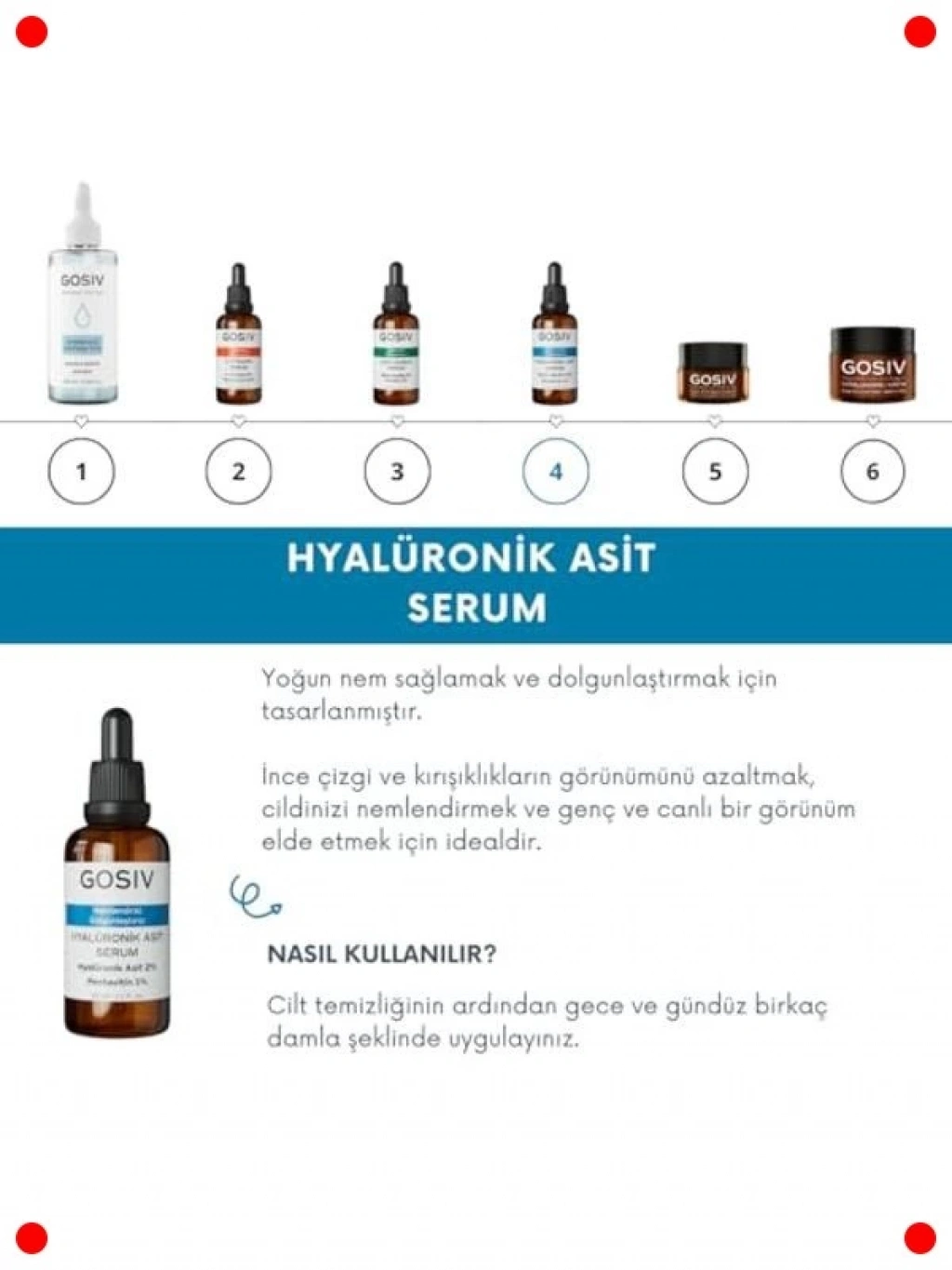 Cildinize yoğun nem ve dolgunluk kazandırmak için tasarlanmış bu hyalüronik asit serumu, cildin alt katmanlarına kadar nüfuz ederek nemi hapseder. İnce çizgi ve kırışıklıkların görünümünü azaltmaya yardımcı olurken, cildin elastikiyetini artırır ve daha pürüzsüz bir doku sağlar. Hafif, hızlı emilen formülü sayesinde cildinizde yapışkan bir his bırakmaz. Tüm cilt tipleri için uygun olup, düzenli kullanımda daha genç, canlı ve ışıltılı bir cilt görünümü sunar. Makyaj altına mükemmel bir baz oluşturur, cildinizi gün boyu nemli tutar.