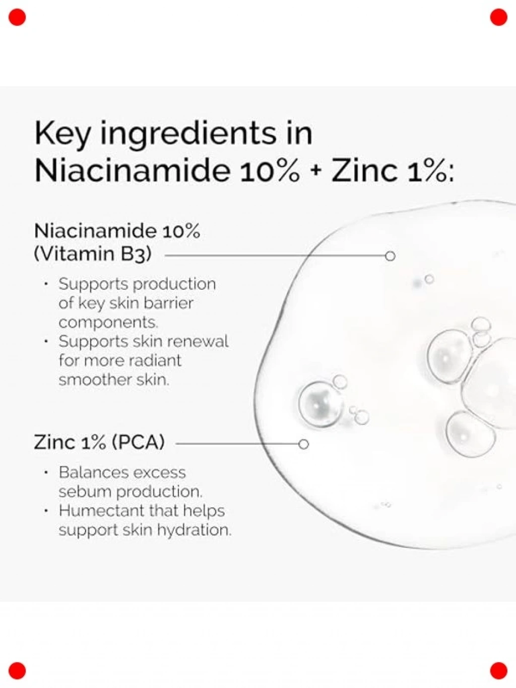 Cildin genel sağlığını ve görünümünü iyileştirmek için tasarlanmış bu yüksek konsantrasyonlu serum, %10 Niasinamid (B3 Vitamini) ve %1 Çinko içerir. Niasinamid, cilt bariyerini güçlendirmeye, gözenek görünümünü minimize etmeye ve cilt tonunu eşitlemeye yardımcı olur. Çinko ise sebum üretimini dengelemeye ve ciltteki kusurların görünümünü azaltmaya destek olur. Özellikle yağlı ve karma ciltler için ideal olan bu formül, cildi matlaştırır ve daha pürüzsüz bir doku kazandırır. Ciltteki kızarıklık ve tahrişi azaltmaya yardımcı olurken, sağlıklı bir cilt görünümü sunar.