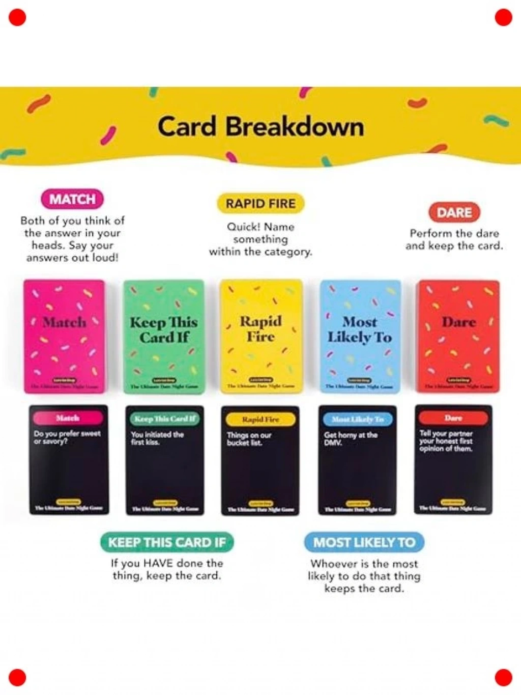 İlişkinizi derinleştirmek ve eğlenceli anlar yaşamak için tasarlandı! Bu randevu gecesi kart oyunu, çiftler arasında keyifli sohbetler başlatmak ve birbirinizi daha yakından tanımanızı sağlamak amacıyla özel olarak hazırlandı. Birbirinden ilginç ve samimi sorular içeren kartlar, kahkahalarla dolu anlar yaratırken aynı zamanda ilişkinizin farklı yönlerini keşfetmenize yardımcı olur. Sevgililer Günü, yıl dönümü veya sadece sıradan bir akşam için mükemmel bir hediye fikri sunar. Bu oyunla kaliteli zaman geçirin, kahkahalar atın ve bağınızı güçlendirin.