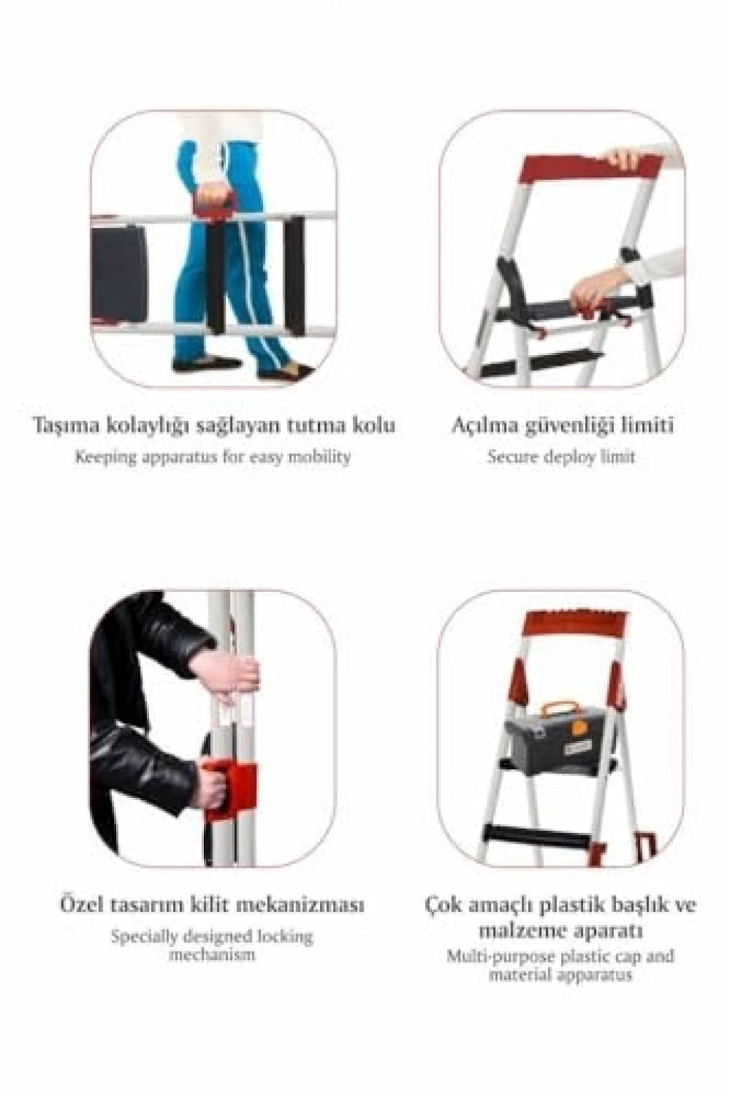 Geniş basamaklı ev ve iş merdiveni, geniş basamakları ile güvenli ve konforlu bir kullanım sunar. Hafif yapısı sayesinde kolay taşınabilir. Farklı yüksekliklere ulaşmak için pratik bir çözüm oluşturarak, her türlü kullanım ihtiyacını karşılar.