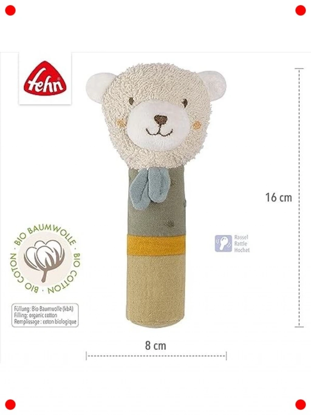 Bebeğinizin ilk oyun arkadaşı olacak bu sevimli ve güvenli çıngıraklı oyuncak ayıyla tanışın. %100 organik pamuktan üretilmiş olup, bebeğinizin hassas cildi için idealdir ve alerjik reaksiyon riskini azaltır. Yumuşak dokusu ve kolay kavranabilen çubuk tasarımı, bebeğinizin motor becerilerini ve kavramasını destekler. İçindeki hafif çıngırak sesi, işitsel duyularını uyararak keşfetme merakını artırır. 0+ aylıktan itibaren tüm bebekler için uygundur. Hem sarılmak hem de oynamak için mükemmel bir seçimdir, bebeğinizin gelişimine doğal ve güvenli bir şekilde katkıda bulunur.