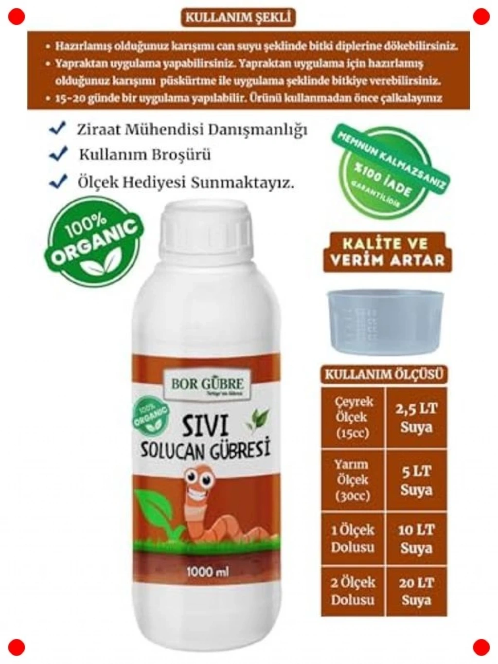 Bitkilerinizin doğal ve güçlü bir şekilde büyümesini desteklemek için tasarlanmış bu 1000ml organik sıvı solucan gübresi, toprağın verimliliğini artırırken bitki sağlığını iyileştirir. Solucanların doğal sindirim süreciyle zenginleşen bu gübre, bitkilerin ihtiyaç duyduğu tüm makro ve mikro besin elementlerini dengeli bir şekilde sunar. Kök gelişimini hızlandırır, çiçeklenme ve meyve verimini artırır, bitkilerin hastalıklara ve zararlılara karşı direncini güçlendirir. Toprak yapısını iyileştirerek su tutma kapasitesini artırır. Tüm bitki türleri için güvenle kullanılabilecek, çevre dostu bir üründür.
