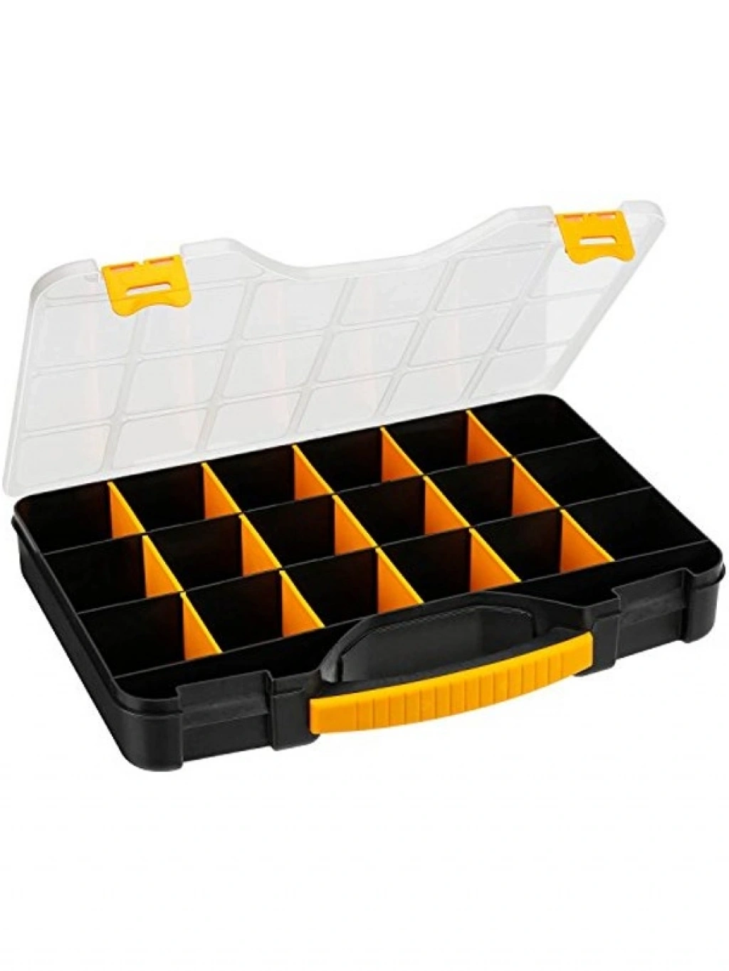 18 inç boyutundaki organizer, siyah ve sarı renk seçenekleriyle düzenli depolama için idealdir. Profesyonel ve hobi amaçlı küçük parçaları korumak ve düzenlemek için kullanılabilir.