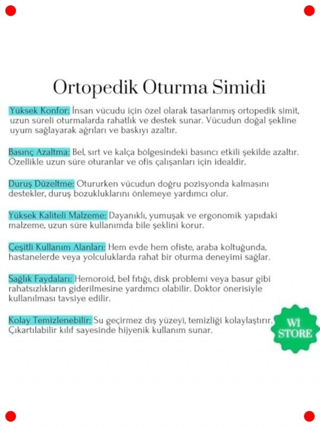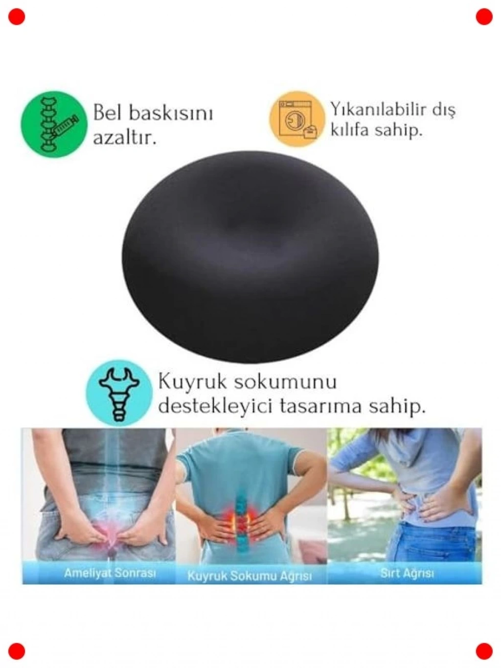 Uzun süreli oturuşlarda konfor ve destek sağlamak üzere tasarlanmış bu ortopedik oturma simidi minderi ile rahatlığınızı artırın. Ergonomik yapısıyla omurga üzerindeki baskıyı azaltır ve doğru oturma pozisyonunu destekler. Hemoroid, basur ve kıl dönmesi gibi rahatsızlıkları olanlar için özel olarak geliştirilmiş olup, bu bölgelerdeki ağrıları hafifletmeye yardımcı olur. Yüksek kaliteli ve dayanıklı malzemeden üretilmiştir, şeklini uzun süre korur. Evde, ofiste sandalye üzerinde veya araç koltuğunda rahatlıkla kullanılabilir. Taşınabilir ve hafif yapısı sayesinde her yere kolayca götürebilirsiniz. Yara veya cerrahi müdahale sonrası iyileşme sürecine de katkıda bulunur.
