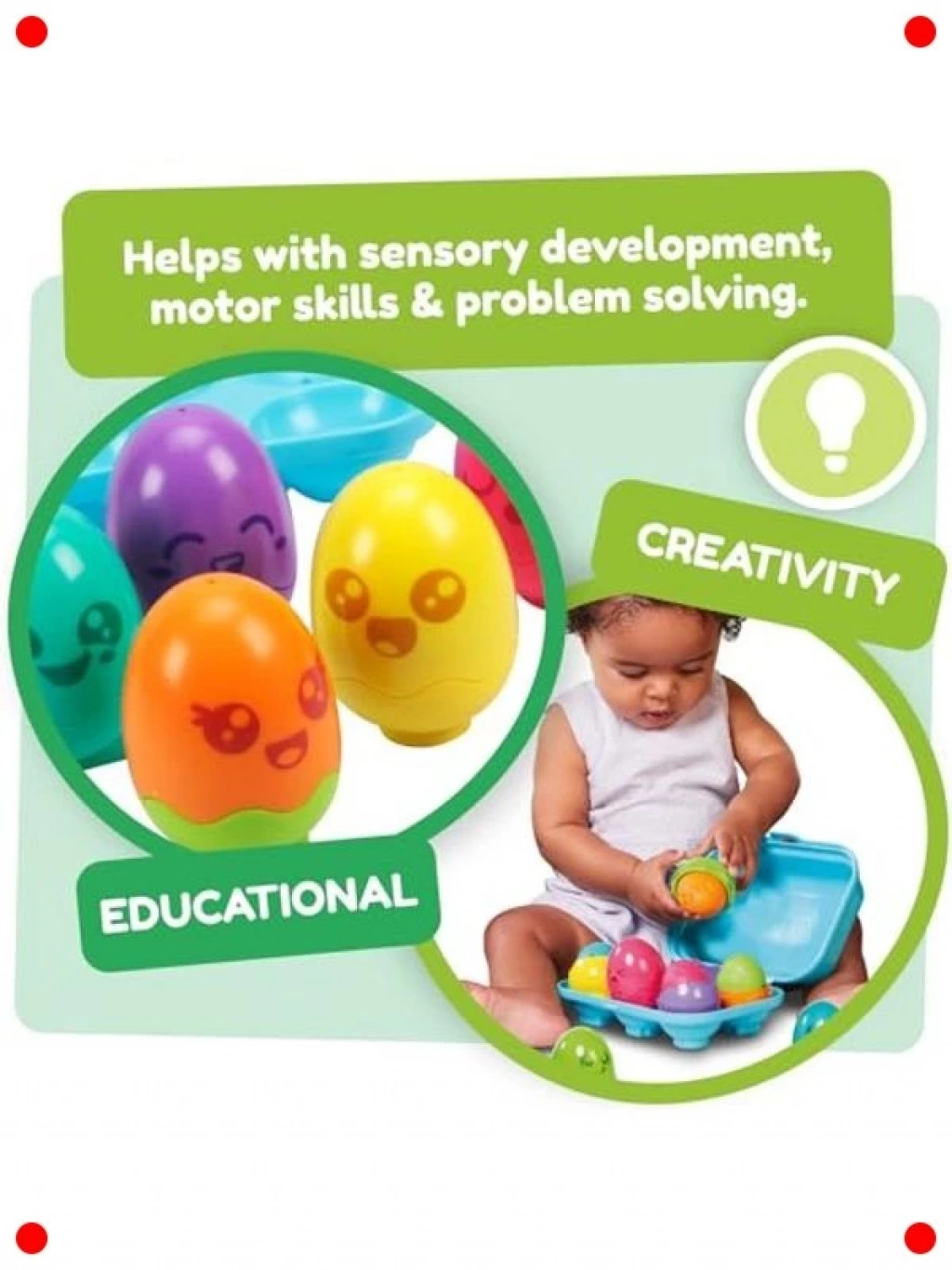 Miniklerin keşfetme ve öğrenme yolculuğunu renklendiren bu parlak renkli saklambaç oyunu yumurtalarıyla tanışın! Her bir yumurta, farklı renklerdeki iç parçalarıyla eşleşmeyi ve sıralamayı teşvik eder. Çocuklar yumurtaları açıp kapatırken, içindeki sevimli sürprizleri keşfederken ince motor becerilerini ve el-göz koordinasyonunu geliştirirler. Canlı renkler ve eğlenceli şekiller, miniklerin dikkatini çekerken aynı zamanda renkleri tanımalarına ve eşleştirme yeteneklerini güçlendirmelerine yardımcı olur. Güvenli ve dayanıklı malzemeden üretilmiştir. Hem tek başına hem de arkadaşlarıyla oynayabileceği bu interaktif oyuncak, eğlenirken öğrenmeyi destekleyen harika bir aktivitedir.