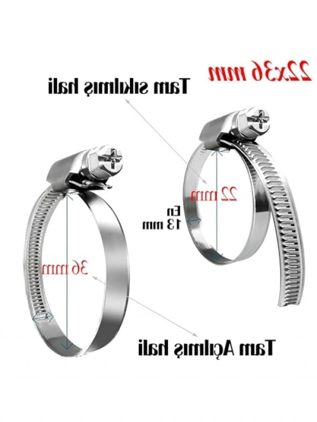 Bu set, 5 adet ayarlanabilir paslanmaz çelik hortum kelepçesini içermektedir. 22x36 mm boyutlarıyla her türlü boru ve hortum için uygundur. Dayanıklı yapısı sayesinde uzun süreli kullanım sağlar. Bahçe, sanayi veya evde çeşitli uygulamalarda güvenilir bir kullanım sunar. Ayarlanabilir klips özelliği ile montajı kolaydır ve her ihtiyaca uygun hale getirilebilir.