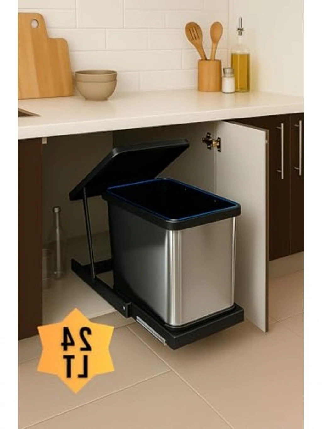24 litre kapasiteli paslanmaz çelik teleskopik çöp kovası, dolap içi kullanıma uygundur. Minimum kapak genişliği 40 cm olan bu ürün, hem yerden tasarruf eder hem de estetik bir görünüm sunar. Teleskopik ray sistemi sayesinde açılıp kapanması oldukça kolaydır. Uzun ömürlü paslanmaz krom yapısı, her türlü mutfak ve atölye ortamında dayanıklılık sağlar.