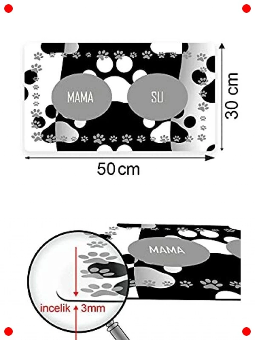 Evcil hayvanınızın yemek ve su kabı altındaki alanı temiz ve düzenli tutmak için tasarlanmış şık pati desenli mama paspası. 50x35 cm boyutlarıyla mama ve su dökülmelerini etkili bir şekilde engelleyerek zeminlerinizin kirlenmesini önler. Kaymaz yüzeyi sayesinde kapların yerinden oynamasını engeller ve evcil hayvanınızın rahatça yemek yemesini sağlar. Kolay silinebilir ve yıkanabilir yapısıyla hijyenik bir kullanım sunar. Siyah-beyaz pati deseni, evcil hayvan köşenize sevimli ve modern bir dokunuş katar. Hem pratik hem de estetik bir çözümdür.