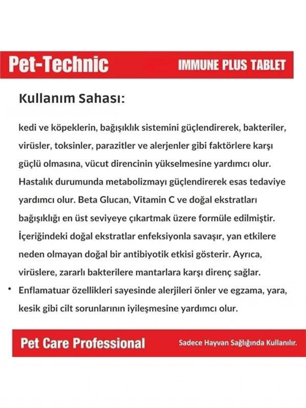 Bu ürün hakkında Güçlü Bağışıklık Desteği BetaGlucan Vitamin C ve Çinko içeriğiyle bağışıklık sistemini destekler hastalıklara karşı direnç sağlar Doğal Antiviral ve Antibakteriyel Etki Propolis Kara Mürver Ekinezya ve Meyan Kökü gibi bitkisel ekstratlar ile enfeksiyonlara karşı koruma sunar Cilt ve Alerji Desteği Enflamasyonu azaltmaya yardımcı olan içerikler sayesinde alerjik reaksiyonları önlemeye ve cilt sağlığını desteklemeye yardımcı olur Hastalık Dönemlerinde Destekleyici Metabolizmayı güçlendirerek iyileşme sürecine katkı sağlar esas tedaviyi destekleyici rol oynar TÜRK ÜRETİMİ Türkiyede üretilen markasının kaliteli ve güvenilir evcil hayvan takviye ürünü Yavru ve Yetişkinler İçin Uygun 8 haftalıktan büyük kedi ve köpekler için uygundur günlük mama ile kolayca karıştırılabilir kullanım dozu veteriner önerisine göre ayarlanabilir