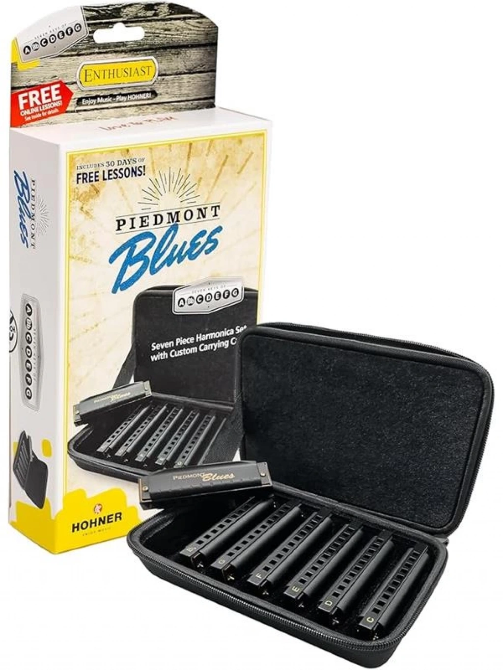 Bu ürün hakkında Piedmont Blues logolu dayanıklı sert bir kutuda yedi şık siyah plastik armonika içerir Çeşitli notalarda blues ve rock şarkılarında çalmak isteyen kişiler için uygundur Armonikalar A Bb C D E F ve Gnin notalarında gelir Kaliteli pirinç sazlar alüminyum levhalar hassas kalıplanmış plastik taraklar plastik kapak plakaları Kasa kanvas tipi kaplamalı ve fermuarlı kapaklı sert köpüktür
