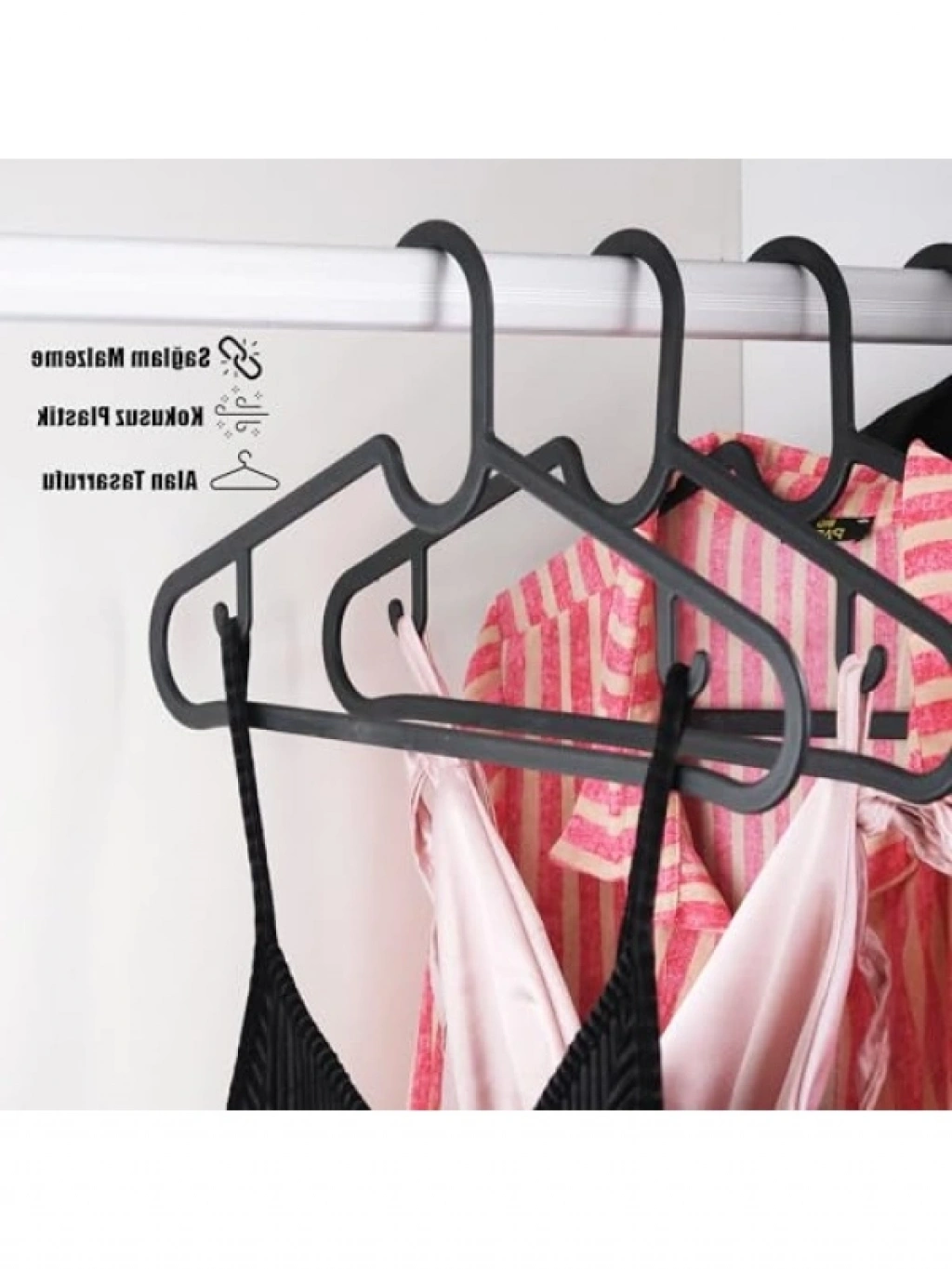 Yüksek kaliteli plastikten üretilmiş bu şık ve ince elbise askıları, dayanıklı ve uzun ömürlü bir kullanım sunar. 10 kg'a kadar taşıyabilen yapısı ile giysilerinizi güvenle asmanızı sağlar. Ağır plastik kokusu yoktur ve bu sayede elbiselerinizi etkileyen kötü kokular oluşturmaz. Esnek ve işlevsel tasarımı, elbisenizin şeklini bozmadan korur. Gömlek, ceket ve pantolon gibi tüm giysiler için idealdir.