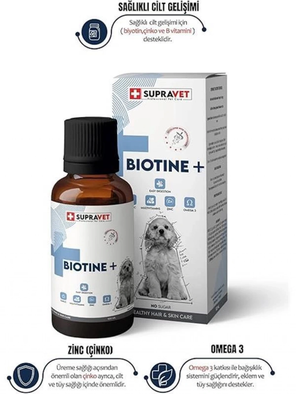 Bu ürün hakkında Plus B For Dogs Biotine Damla 100 ML Zinc Multi Vitamin ( Köpekler Için Tüy Sağlığı Damlası )Köpekler için Tüy Sağlığı Multivitamin DamlasıBiotin ve Çinko ile Sağlam ve Parlak Tüyler Biotine multivitamin köpeklerin biotin ve çinko ihtiyacını karşılar Köpeğinizin sağlıklı deri ve tüy yapısına sahip olması için gerekli vitamin ve mineralleri içerir Kuru ve mat tüylere canlılık verir Dermatolojik problemlerin giderilmesinde destek olur Derideki kuruluğa ve kaşıntıya karşı cildi nemlendirir rahatlatır