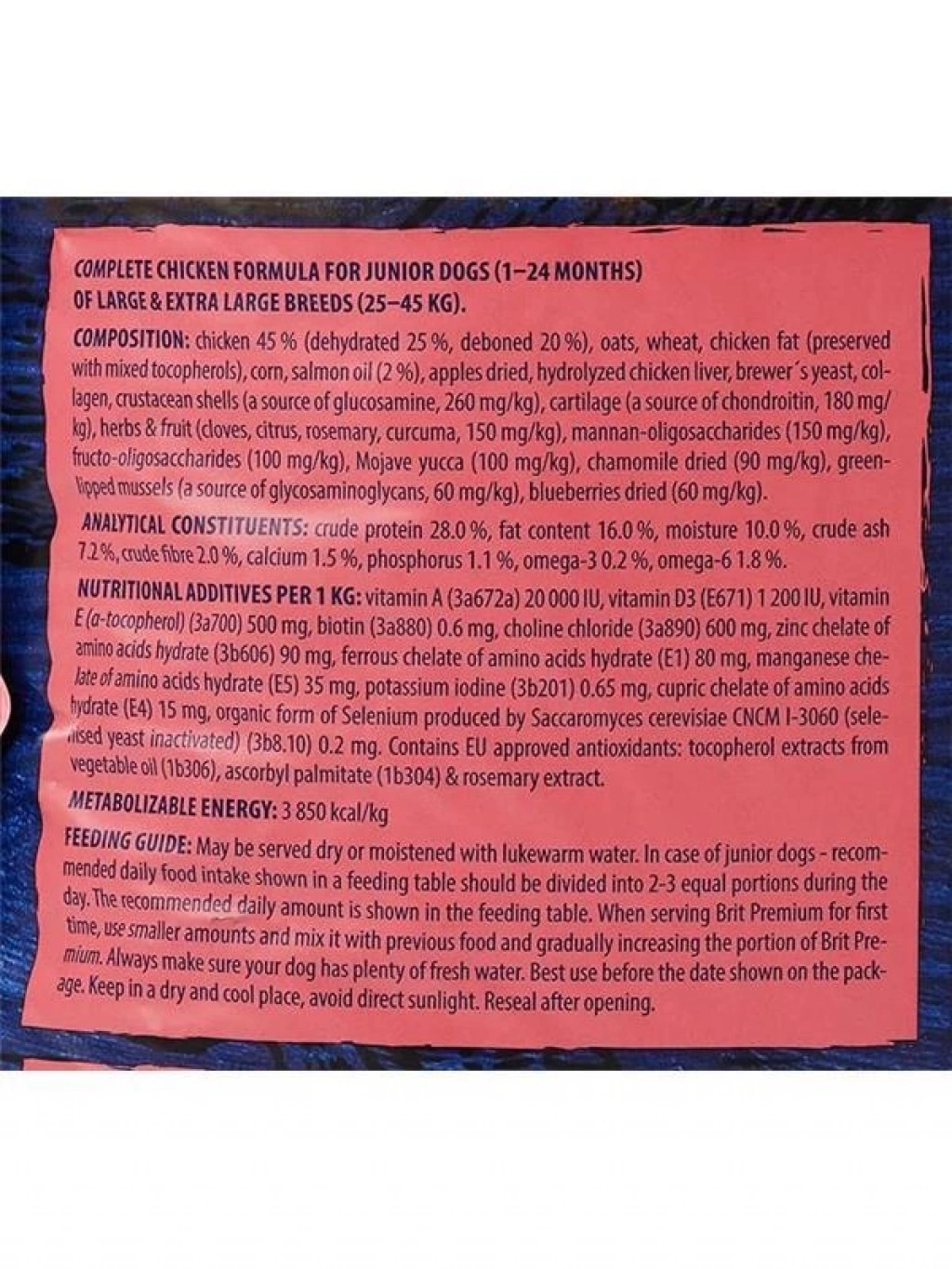 Bu ürün hakkında Büyük Irk (2545 kg) Yavru ve Genç Köpekler (124 ay) için tam ve dengeli Tavuk Formülü Tavuk 45 (kurutulmuş 25 kemiği alınmış 20) yulaf buğday tavuk yağı (karışık tokoferollerle korunmuş) mısır somon yağı (2) kurutulmuş elma hidrolize tavuk ciğeri bira mayası kolajen kabuklu kabukları (glukozamin kaynağı 260 mgkg) kıkırdak (kondroitin kaynağı 180 mgkg) otlar ve meyveler (karanfil narenciye biberiye zerdeçal 150 mgkg) mannanoligosakkaritler (150 mgkg) kg) fruktooligosakkaritler (100 mgkg) Mojave yucca (100 mgkg) kurutulmuş papatya (90 mgkg) yeşil dudaklı midye (bir glikozaminoglikan kaynağı 60 mgkg) kurutulmuş yaban mersini ( 60 mgkg)
