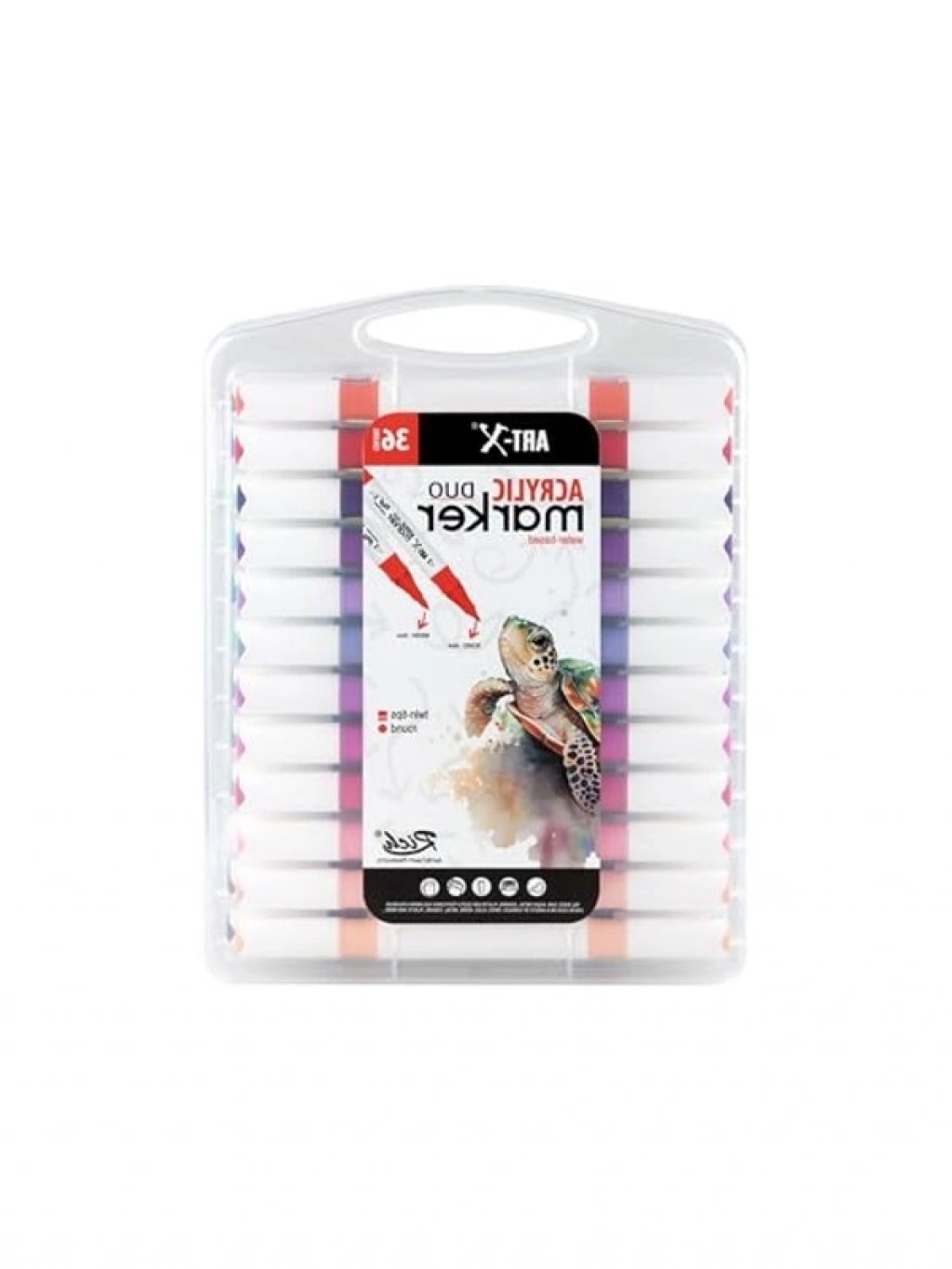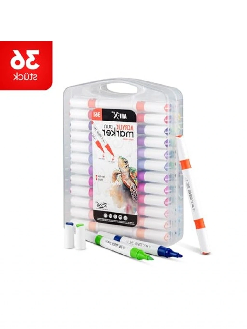 Profesyonel akrilik marker kalem seti, 36'lı içeriği ile birçok farklı yüzeyde kullanıma uygundur. Su dirençli akrilik formülü sayesinde kalıcı sonuçlar elde etmenizi sağlar. Çift uçlu tasarımı ile detay çalışmaları ve geniş alan boyamaları için idealdir. Taşınabilir yapısı ile birlikte, sanatsal projelerinizi her yerde gerçekleştirebilirsiniz.