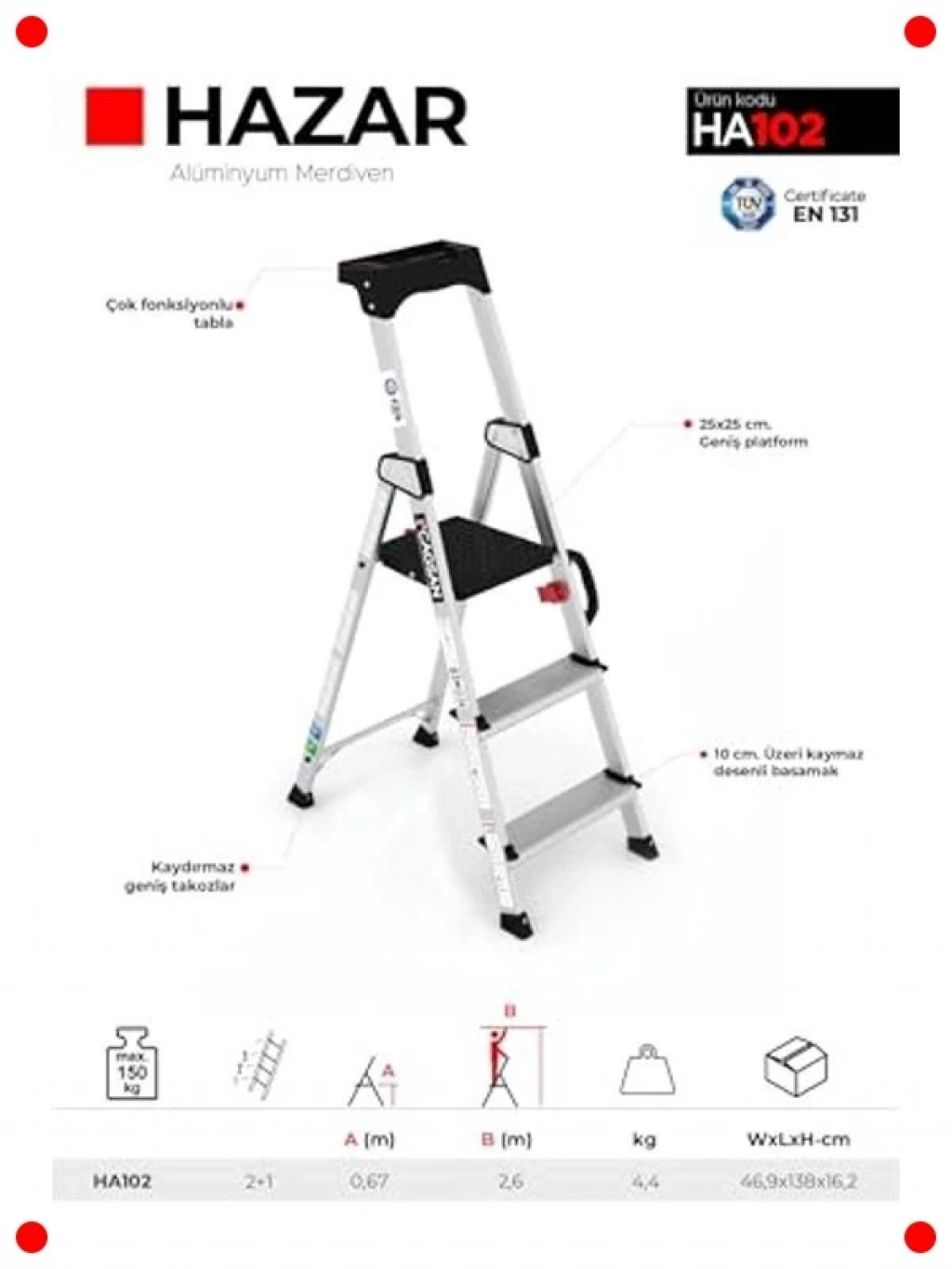 Evinizdeki veya iş yerinizdeki yüksek noktalara güvenle ulaşmak için tasarlanmış bu profesyonel alüminyum merdiven ile tanışın. 2 ana basamağı ve ekstra bir üst platform basamağı (2+1) ile toplamda üç farklı seviyede çalışma imkanı sunar. Hafif ancak son derece dayanıklı alüminyum yapısı sayesinde kolayca taşınabilir ve uzun ömürlü bir kullanım sunar. Geniş basamakları ve kaymaz ayakları, güvenli bir çalışma ortamı sağlarken, dengeyi artırır. Katlanabilir tasarımı sayesinde kullanılmadığı zamanlarda az yer kaplar ve kolayca saklanabilir. Ev işlerinden profesyonel tadilatlara kadar geniş bir kullanım alanına sahiptir, güvenliğinizi ve konforunuzu ön planda tutar.