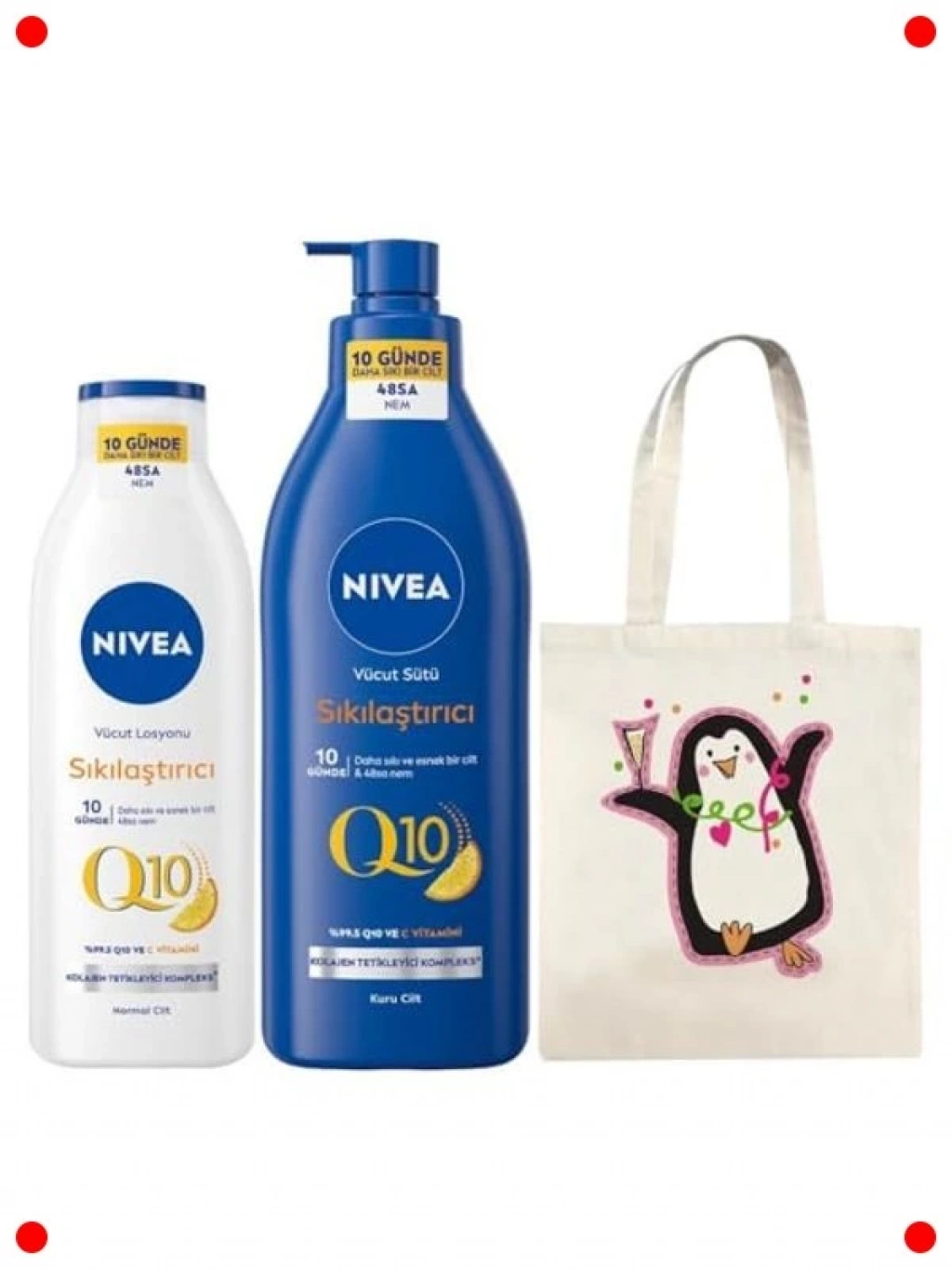 Cildinize sıkılık ve canlılık kazandırmak için özel olarak geliştirilmiş bu vücut bakım seti, Q10 ve C vitamini ile zenginleştirilmiştir. Vücut sütü ve vücut losyonundan oluşan bu set, cildinizi 48 saate kadar yoğun bir şekilde nemlendirir. Q10 cildin doğal elastikiyetini artırırken, C vitamini cilde aydınlık ve pürüzsüz bir görünüm kazandırır. Hızlı emilen formülleri sayesinde ciltte yağlı bir his bırakmaz. Düzenli kullanımla cildinizin daha sıkı, pürüzsüz ve genç görünmesine yardımcı olur. Eksiksiz bir vücut bakımı için ideal seçimdir.