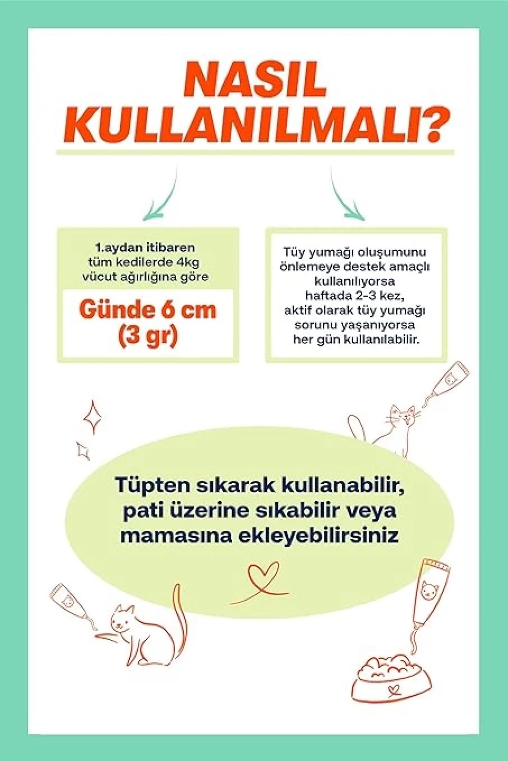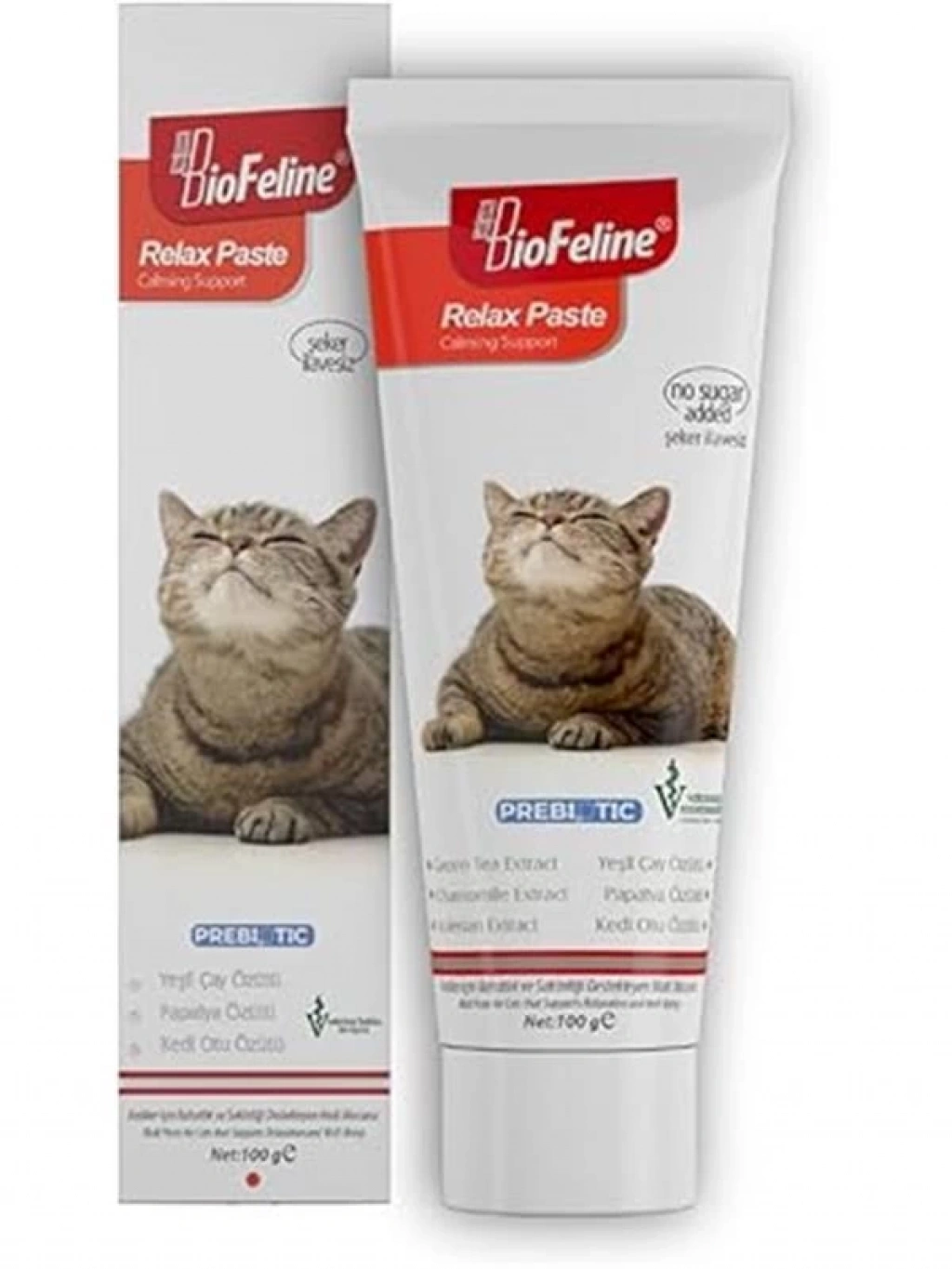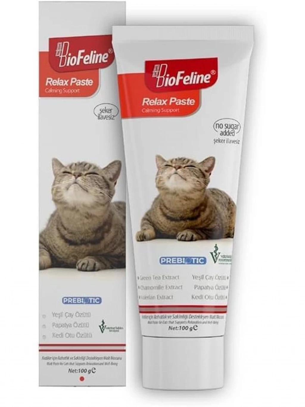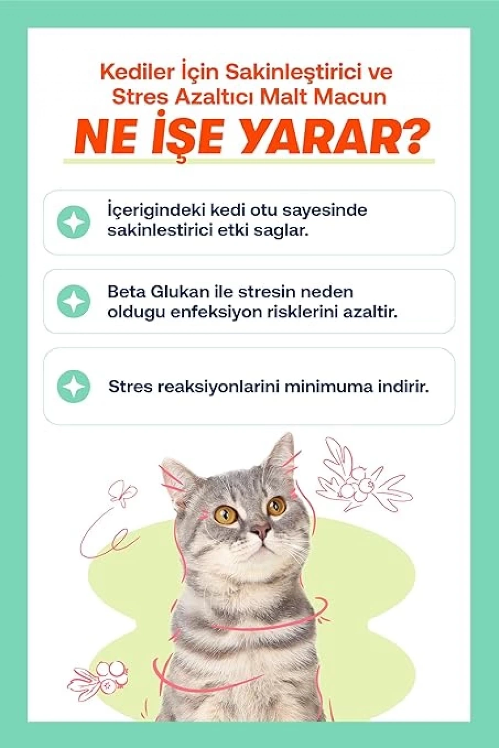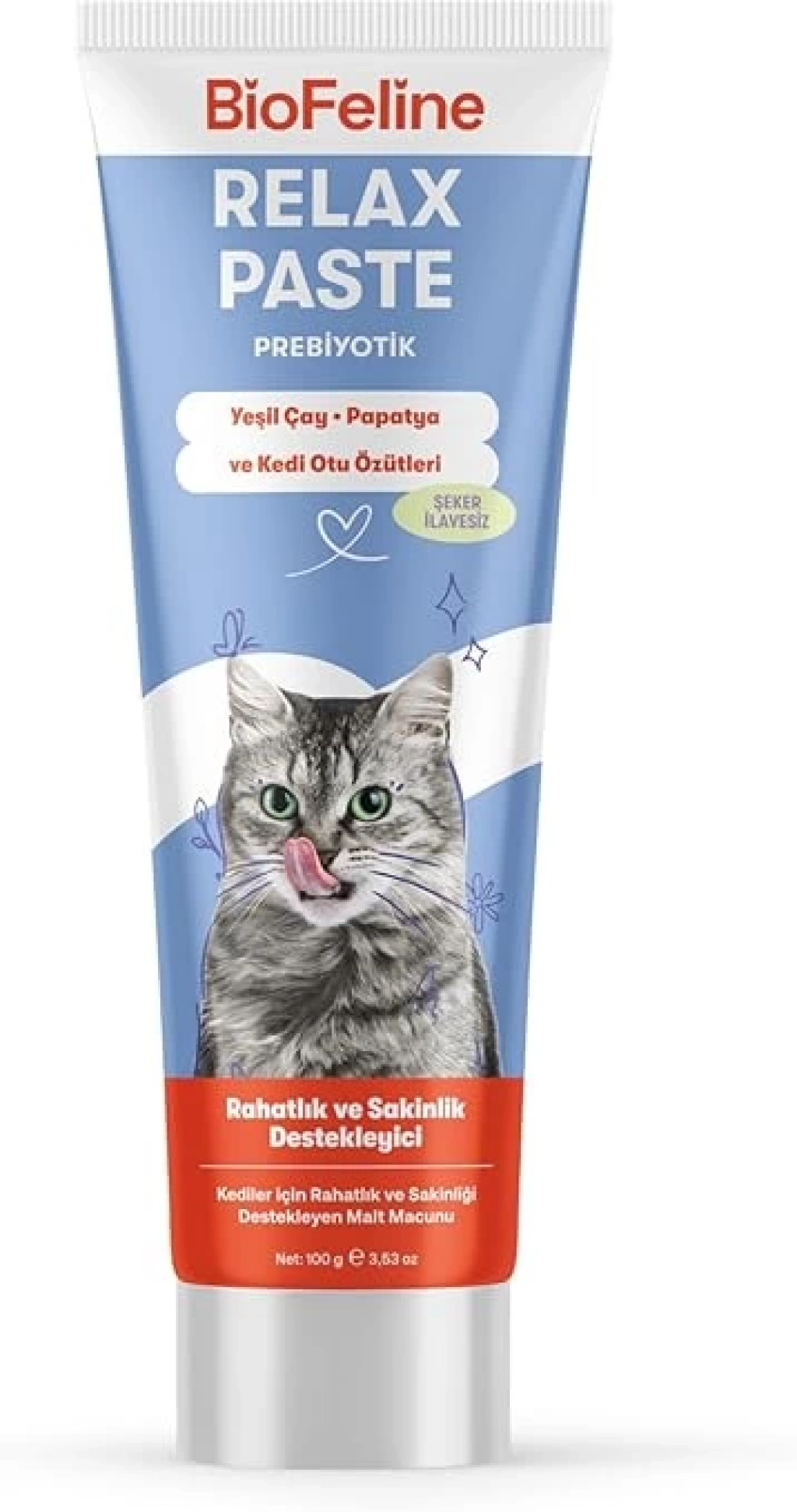 Bu ürün hakkında Stresi azaltan ve kedinizin hayatını kolaylaştıran sakinleştirici kedi otu ve kaygıyı azaltan etkisi olan ağrı dindirici ve hafif antidepresan etkisi olan kantaron kedinin vücudunda stresin sebep olabileceği enfeksiyonları azaltan Betaglukan içerir Stres reaksiyonlarını ve onların sağlık ve esenlik üzerindeki etkilerini azaltır Ayrıca bağırsakta biriken tüyler kedinizde iştahsızlık kusma gibi belirtilerle ortaya çıkan sindirim problemlerine yol açabilir Relax Paste en önemli özelliği tüm boşaltımın sağlıklı ve doğal olarak yapılmasını sağlamaktadır Şeker içermez
